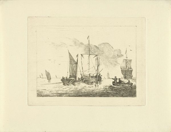 Gerrit Groenewegen made this etching of a grounded Kraak in 1801. In the Dutch Republic of the late 18th century, maritime power was central to the nation’s identity and economy. The image presents a grounded ship, a stark contrast to the usual depictions of Dutch maritime prowess, and it subtly critiques the Republic's declining naval dominance. The level of detail and the ship's stillness invite contemplation on the state of Dutch maritime affairs. The print also functions as a visual record. It meticulously documents the design and structure of a Kraak, offering a practical, technical understanding of shipbuilding. Such records were crucial for the Dutch, who relied heavily on seafaring for trade and defense. Historical research into Dutch maritime history, economic data, and naval records would offer a more complete understanding of Groenewegen's work.