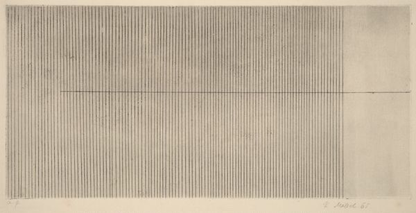 Editor: Here we have Brice Marden’s "Untitled" drawing from 1965, a work on paper using graphite. The dense vertical lines and subtle textures make it seem almost textile-like. What strikes you about this piece? Curator: The drawing presents a fascinating insight into Marden’s process. Note the handmade quality: the lines aren't mechanically precise. We're immediately confronted with labor. The layering of graphite – almost obscuring the verticality at times – suggests a repetitive, durational act. Do you see any relationship between the process and what may be happening socio-politically at this time? Editor: It reminds me a bit of weaving, where the final image is the result of repetitive motions. 1965, though, feels quite loaded politically. The Civil Rights movement was gaining momentum, and there was growing dissent over the Vietnam War. Curator: Precisely. Can we view this "obscuring" as an allusion to socio-economic or political entanglements? Could the seemingly simple act of layering graphite function as a metaphorical commentary on concealment, protest, or complexity? Editor: It's compelling to consider that what feels purely abstract might be a commentary on labor, materials, and the socio-political landscape of the time. It definitely enriches my understanding beyond just visual appeal. Curator: Indeed. By foregrounding the 'making' of the art object – the inherent qualities of graphite and paper, the evidence of the artist's hand – Marden pushes us to consider the materiality and production within a broader social context. Editor: Thinking about art through its materials and the context in which it was created offers a whole new perspective. Thanks for pointing out the possibilities in that direction.
