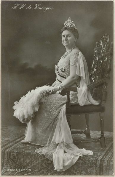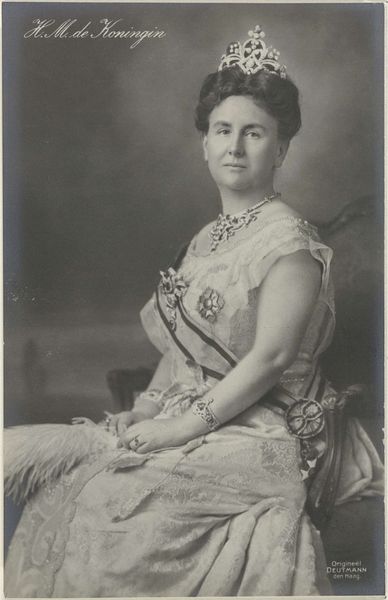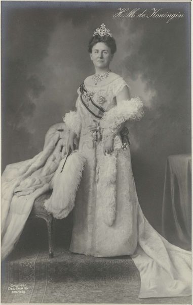 Editor: This is a portrait of Wilhelmina, Queen of the Netherlands, dating back to 1897. It appears to be a photograph, capturing a young queen in all her regal attire. It feels like a carefully constructed image, intended to project power and stability. What stands out to you? Curator: It's fascinating how photography was used here as a tool for nation-building. Wilhelmina ascended the throne at a young age, and images like these were instrumental in solidifying her authority and the monarchy's image. Consider how the photograph's distribution shaped public perception of the queen. Editor: So, it's less about capturing a likeness and more about crafting a specific message? Curator: Precisely. The heavy use of royal regalia – the crown, the fur stole, the jewels – it's all meticulously arranged to convey authority and grandeur. Think about the intended audience. How would this image have been received in different social classes at the time? And what did it mean for a young woman to embody such a weighty symbol of power? Editor: That’s interesting. I hadn’t thought about the differing reactions based on social class. It almost feels staged, knowing that it's meant to be a symbol more than a person. Curator: It is staged, absolutely. It's a carefully curated performance for the camera, reflecting the complex interplay between the individual, the institution, and the public gaze. How does it affect your view knowing this photograph's potential to further cement the image of a nation? Editor: Seeing it that way, it’s like understanding a completely new layer of meaning, thinking about its societal impact. Curator: Indeed. It’s not just a pretty picture; it's a powerful piece of visual propaganda, skillfully deployed in a time of immense social and political change.