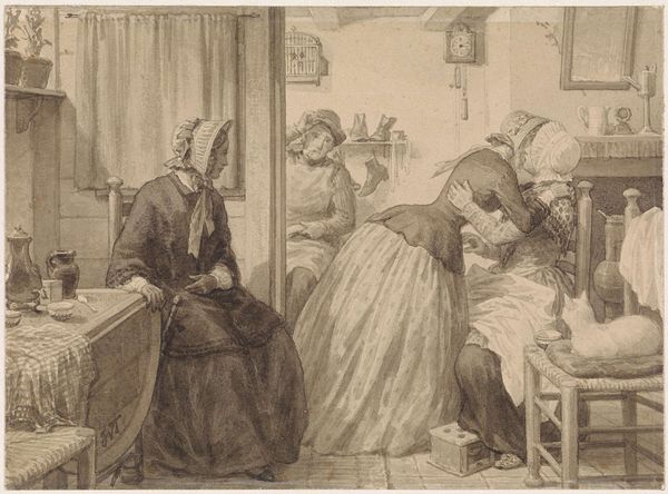 Curator: Here we have "Pea Shellers," a print realized around 1737 by Anne Claude Philippe Caylus. Currently, this piece resides at the Metropolitan Museum of Art in New York. Editor: There’s a hushed quality to it. The monochromatic lines render a scene almost suspended in time; the texture appears surprisingly smooth, almost like polished stone. It's remarkably simple in its composition. Curator: It certainly possesses an intimacy. We observe two women engrossed in their work. Notice how the visual elements speak to the roles within this intimate setting, almost suggesting the transmission of knowledge across generations. It reflects the cultural memory embedded within everyday activities. Editor: The way the artist renders light and shadow is compelling. See how the hatching defines the forms. Also, the artist sets a focal point with a clear articulation of detail towards the front and the upper right, allowing more general articulation elsewhere to bring that detail to the forefront. The stark cubic structure provides a grounding anchor to the more organic forms. Curator: Precisely! Consider the symbolic implications of the peas themselves— a motif of nourishment, perhaps also reflective of shared labor and the bonds between people. This intimate act reflects how cultural continuity is woven into mundane aspects of life. The artist invites reflection upon the significance of daily practice. Editor: Do you think it reveals more of a Rococo taste of its time or a Neoclassical desire for clarity? There is an unusual restraint. Perhaps the linear, somewhat simplified rendering makes it appear to transcend these distinctions. It certainly captures the moment with such delicacy. Curator: Ultimately, the piece invites a reevaluation of what we consider significant. Through this representation of commonplace actions, Caylus transforms labor into something almost sacred, showcasing its inherent worth within culture. Editor: The longer I look, the more compelling the surface becomes. It’s an unpretentious testament to the potential of simple lines to evoke so much depth and emotion. It offers so much clarity through visual design and line.