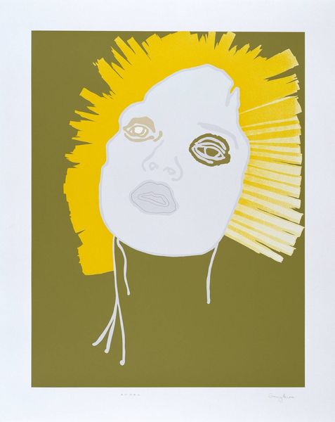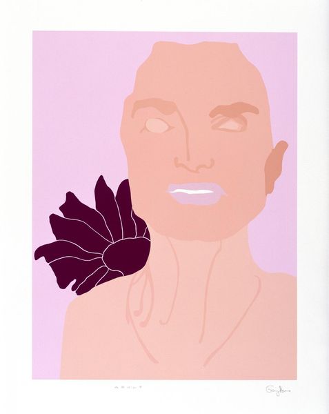 Editor: Here we have Gary Hume’s "Lady Parker." It’s quite striking, a portrait rendered in flat planes of lilac and gold. What can you tell us about the context of this piece? Curator: Hume's work often engages with ideas of celebrity and the objectification of women. Consider how the simplification of Lady Parker's image—the flat color, the minimal lines—might comment on the way female figures are reduced to commodities within popular culture. Editor: So, is Hume critiquing the media’s representation of women? Curator: Precisely. He presents us with a flattened, almost generic image, prompting us to question the gaze and the power dynamics inherent in portraiture and celebrity culture. What does the color choice suggest to you? Editor: The lilac feels almost artificial, maybe highlighting the artificiality of the image itself. Curator: Exactly. It invites us to consider how these constructed images shape our perceptions and expectations of women. Editor: I hadn’t considered all the layers of social commentary. Thanks! Curator: It’s crucial to explore those layers and challenge the status quo!