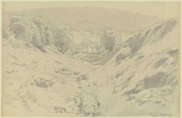 Curator: Looking at this pencil drawing, it evokes a rather quiet mood, wouldn't you say? Almost melancholic. Editor: Absolutely. It’s spare, yes? Let me introduce it. This work, "Weg door bergen met uitzicht over vlak land" or "Road Through Mountains Overlooking Flat Land" is by Cornelis Lieste, made sometime between 1827 and 1861. Look at how the artist has used just pencil on paper to define such expansive space. What does this suggest about 19th century artistic vision and practices to you? Curator: Well, examining the medium – pencil on paper – reveals accessibility. Sketches like this, inexpensive and portable, would have allowed artists to record landscapes directly, enabling greater opportunities to study places more efficiently and create more landscapes on the go to eventually be rendered more carefully into formal paintings in studios. The sketch becomes a tool. Editor: Precisely! The *tool*. Consider this drawing not just as a preliminary study, but as a vital component of the artistic process that allowed for democratization. This reflects a changing social landscape in 19th century artistic production, too. Artists were increasingly unbound by the formal studio, with less constraints they were enabled to record and present a much broader range of scenery to the public. Curator: It does make one wonder, though, about the context of its creation. Did Lieste see the location as it was, or was he aiming for something deeper? It is romanticism, after all, even within the confines of realism and its lines. Editor: True. Its form is deceptive because of how 'simple' or immediate it looks. Yet it speaks volumes about control. This is not necessarily how nature 'is', but is more concerned about the way nature is conceived, manipulated by the artist to frame and deliver an idea: what does this composition suggest in relationship to our contemporary times, perhaps the illusion of control? Are the roads 'leading somewhere' in society today, or merely offering an *illusion* of such? Curator: It seems he certainly captured more than just the scenery before him. A sketch of something, but evocative and so self-contained, an act in itself rather than just a means. Editor: So much potential bound within the deceptively simple medium of paper and pencil. Let’s leave our listeners with that paradox.