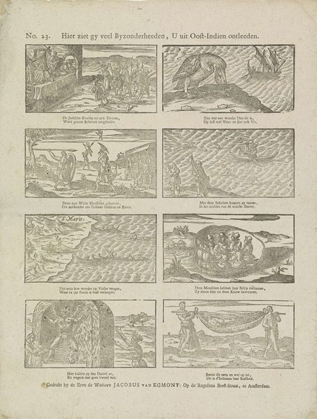 Curator: Allow me to introduce "Verhaal van Mozes," an engraving created between 1850 and 1881 by Dirk Noothoven van Goor. Editor: My initial reaction? This feels almost like a storyboard—six distinct scenes meticulously arranged, creating a sequential narrative. Curator: Precisely. It showcases episodes from the life of Moses, rendered in that characteristic Dutch Golden Age style. Note the graphic clarity, the deliberate contrast of light and shadow; how would you evaluate the overall effect? Editor: There’s an undeniable didactic purpose here. The linear format guides the viewer, and in turn enforces a Eurocentric vision of history and faith that privileges legibility over ambiguity. Curator: A fitting observation, yet the precision itself commands attention. Each scene is contained within its frame, showcasing distinct compositional decisions—grouping, perspective, contrast—drawing our focus through its graphic strength. Editor: Though these choices tell a complex story, the fact remains that many stories that focus on a singular religious or national identity contribute to erasure and simplification. The colonial overtones—in that context—become impossible to ignore. Curator: Indeed, we need not overlook the historical context. But can we acknowledge the artist's engagement with printmaking techniques here? The fine lines of the engraving achieve remarkable textural detail. Editor: A valid observation. However, how might we interpret the stark depiction of power and divine law through a contemporary lens, accounting for the marginalization of those rendered invisible within these visual narratives? It invites contemplation regarding its ethical responsibility. Curator: Point taken. Though, regardless, consider Noothoven van Goor's "Verhaal van Mozes" as a compelling object lesson. Editor: In its layered context and complex implications.