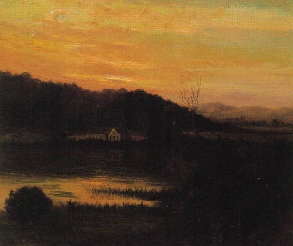 Editor: Here we have John Atkinson Grimshaw's, "A Manor House in Autumn", executed with oil paint. The mood seems a bit somber and dreamlike, doesn't it? That golden haze makes the old house look almost… spectral. What do you make of this piece? Curator: It whispers stories, doesn't it? To me, the painting evokes a sense of longing, of peering into a forgotten time. The pre-Raphaelite influence is clear: the sharp detail contrasting with the atmospheric golden fog... Do you see how Grimshaw plays with light here, creating this almost stage-lit effect? Like a scene from a gothic novel... Makes you wonder what mysteries that manor holds. Editor: Yes, the light definitely adds to the mysterious mood. I hadn't really connected it to gothic novels, but now that you mention it, I see the resemblance! Do you think the details were painted as accurately as possible? It does resemble something so hauntingly romantic. Curator: Accuracy… Hmm. Grimshaw definitely had an eye for detail – look at the brickwork, the branches of those stark trees, or maybe the reflections in the water after the rain – yet it's all softened, filtered through this dreamlike haze. Perhaps that’s it: not exact replication, but emotional accuracy. An attempt to render feeling itself, don’t you think? I wonder what stories Grimshaw would tell. Editor: That's beautifully put – "emotional accuracy." I will have to remember that! Thanks for sharing your thoughts. It makes the painting much more interesting, definitely! Curator: My pleasure! It's like the painting was merely waiting for the right voice, you know, the one that would echo from inside its golden hue!