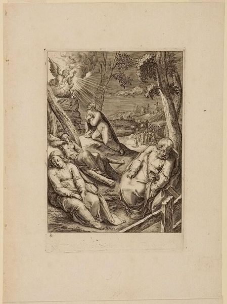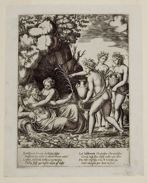 Editor: This print, "The Rivers Console Peneus for the Loss of Daphne," is by an anonymous artist. The scene feels quite dramatic, with figures emerging from what seems to be both landscape and water. What symbolic meanings do you see embedded in this image? Curator: The grieving river god Peneus is surrounded by other rivers, a symbolic landscape mirroring his emotional state. Water, a potent symbol of both life and grief, flows from their urns, highlighting the cyclical nature of loss and consolation. Do you notice the laurel tree and Daphne in the upper register? Editor: Yes, she is in the laurel tree, an escape from Apollo's pursuit, and then again as a figure in the sky. Curator: The artist encodes the narrative of transformation through repeated visual motifs of the female figure. It's an expression of the enduring impact of mythological narratives. Editor: So, it's about more than just sadness; it's about the enduring power of myth and transformation. Curator: Exactly. It's a reminder that symbols carry layers of meaning, echoing through time.