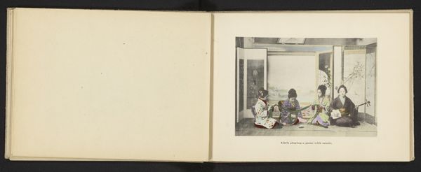 Curator: Let's turn our attention to this striking image titled "Twee vrouwen bij een verkoper van luxe goederen," dating from before 1900. It's a fascinating piece employing both print and photography, hinting at a blend of techniques common at the time. What are your initial thoughts? Editor: It immediately evokes a sense of stillness, a quiet transaction almost ritualized. The composition is very balanced, and there's an intentional layering in the depiction of the figures. However, what I find really interesting is the hint of orientalism in it, probably as part of Japonisme movement. Curator: Indeed, Japonisme, an art movement heavily influenced by Japanese art and design, is clearly present. This work encapsulates a broader cultural phenomenon where European artists and consumers became captivated by Japanese aesthetics and luxury goods. Note the deliberate use of photographic reproduction combined with printmaking to distribute these images widely, impacting perceptions of Japanese culture. Editor: Exactly. And thinking about that distribution and reception, I wonder how this image played into constructing a specific narrative around gender roles and economic power. Who were these luxury goods for, and who was excluded from participating in this transaction, culturally or financially? Curator: That's a crucial point. We must consider who is centered and decentered in this visual narrative. While seemingly an innocent genre painting, it prompts critical questions about cultural appropriation, exoticism, and the marketplace’s role in perpetuating stereotypes. The 'authenticity' it appears to strive for is highly curated, shall we say? Editor: Yes, the framing is all important: considering who created the image and how that viewpoint affected which narratives were being told – and who was being served by them. To me, the image speaks to larger conversations surrounding representation, consumerism, and the subtle power dynamics inherent in cross-cultural interactions. Curator: Analyzing this piece offers a valuable opportunity to delve into art’s connection with cultural exchange and social power structures. Editor: Absolutely. Looking closely reveals the layers of meaning and reveals crucial ideas that linger long after the exchange depicted.