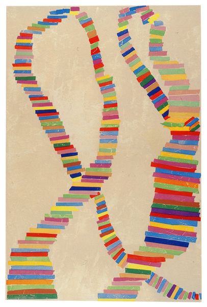 Curator: Before us is Pedro Calapez’s 2010 acrylic painting, “Joker”. Editor: My initial thought is one of organized chaos. The colors are vibrant, yet the overall shape seems almost like a deconstructed ideogram, with those distinct streaks. It gives an impression of both energy and disarray. Curator: It’s interesting you say that because, as an artwork, "Joker" speaks volumes about process. Calapez's consistent use of acrylic allows for this layering and visible brushwork. There's a tangible emphasis on the materiality and construction, rather than an illusionistic rendering. I’m especially drawn to how the acrylic paint is layered to create textures. Editor: The application technique you noted—the visible labor in the making of the object, so to speak—resonates deeply with how art historical narratives have traditionally sidelined the contributions of the working classes, as well as crafts considered outside the canon. Looking at "Joker," the composition and color palette gestures at a type of late modernist aesthetic, though infused with gestures linked to movements such as pop art. Curator: Precisely. And considering how so-called high art has often been divorced from functional or everyday applications, Calapez blurs the lines, suggesting a reconsideration of where and how art exists in our world and within society. Editor: And there is so much that one can extract through such a work when discussing societal narratives as well. Thinking of abstraction's historical exclusion of many—the notion of art being neutral—but then looking at “Joker”, a painting from the 21st century, it speaks to who is invited in or excluded from art spaces, too. Curator: Definitely. For me, “Joker” invites viewers to appreciate not only the finished piece, but also the active labor of creation, pushing viewers to observe and contemplate the work itself rather than immediately going to its deeper meanings or themes. Editor: This approach really enriches how we see contemporary works because it helps broaden interpretations, acknowledging socio-political implications in art. Thanks for guiding us through "Joker" today; I can’t stop thinking about the politics inherent within its materiality! Curator: Likewise; by focusing on how artists like Calapez use materials and methods, we uncover new layers of meaning within artworks, especially concerning labor and production itself.