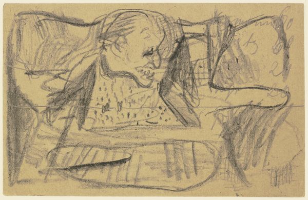 Editor: We're looking at "Handorgler am Abend" by Ernst Ludwig Kirchner, created in 1924. It's a drawing on paper using pencil and chalk. It feels like a very fleeting moment captured, almost like a memory fading. What do you see in this piece? Curator: It's tempting to view Kirchner’s work solely through a lens of personal experience, especially given his biography. However, "Handorgler am Abend" compels us to consider the larger socio-political landscape of Weimar Germany. We must see how the image resonates, or perhaps conflicts, with public perceptions of entertainment and community. What sort of audience do you think the Handorgler might have attracted at this time? Editor: Well, the figures in the background suggest a small, local gathering. The scene is rather informal. Curator: Exactly. Consider then, the evolving role of street musicians and public gatherings in a society grappling with economic instability and shifting social norms. How might the public’s reception of a simple accordion player reflect broader anxieties or desires of the era? Kirchner, whether intentionally or not, provides a snapshot of this dynamic. Notice the contrast between the sharp angularity and the softness of the medium. Does it feel in tune with what we might know of Germany in the 1920s? Editor: Yes, it definitely hints at some social tensions, some level of precariousness. It seems to represent more than a pleasant street performance. I’d thought of it as just an everyday moment. Curator: Often, everyday moments are where the power resides. Art gives us an avenue to understand culture, its symbols, what the politics were and even maybe what they are now. How artists represent public gatherings gives great insight into cultural and historical change. Editor: I hadn’t really considered its relationship to that specific cultural background before, seeing it now with this insight has given me a richer view of this scene and this moment in history. Thank you.