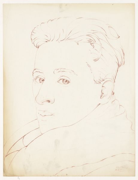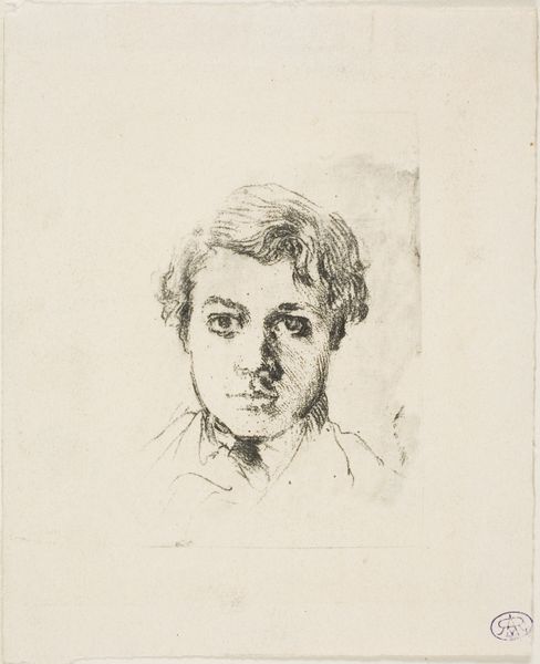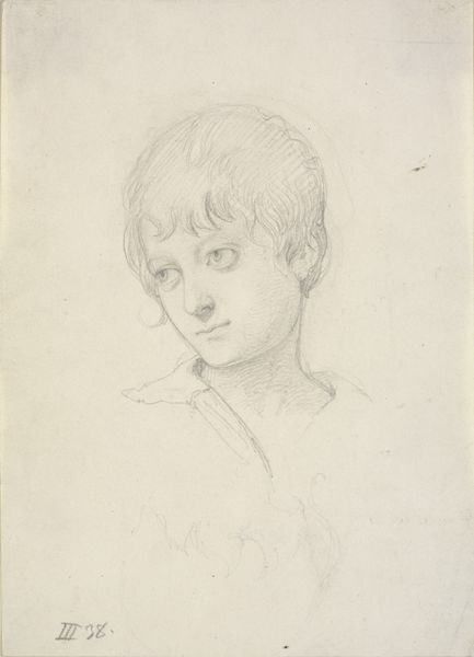 Curator: Good morning. We are standing before Nikolaus Hoff's sensitive pencil drawing, "Bildnis des Bruders des Künstlers, Carl Hoff, als Knabe von dreizehn Jahren," or, Portrait of the Artist’s Brother, Carl Hoff, as a Boy of Thirteen Years, created in 1820. Editor: The gentleness of the light pencil on this slightly discolored paper makes the image appear intimate and dreamlike. The soft edges of Carl’s features and hair contribute to the image’s fleeting quality—a memory of fleeting youth itself. Curator: Notice the technical facility of Hoff's cross-hatching to create depth, particularly in the treatment of light and shadow on Carl's face and hair. His ability to capture texture using such limited means is quite impressive. Editor: Beyond pure technique, consider the context: A portrait of a boy, poised on the cusp of adulthood, rendered during a time of significant social upheaval across Europe. His androgynous presentation—the flowing hair and soft features—destabilizes traditional masculine portrayals and can open discussion around gender and identity during that period. How did social norms affect identity for non-ruling-class men like him? Curator: While sociopolitical readings are valid, focusing solely on those aspects risks obscuring the nuanced formal aspects of this image. His sidelong glance and barely-there, neutral mouth gives nothing away about the relationship or intention—and even resists assigning too much internal meaning to Hoff’s choices. I feel this elusiveness enhances the image's aesthetic complexity, inviting interpretation on the part of the viewer without imposing a single narrative. Editor: Perhaps, but let's not detach art from life; Nikolaus Hoff surely meant for his drawing to connect to the boy Carl, and viewers from that era would probably recognize, and sympathize with, those connections. As Carl navigates societal expectations, Hoff, as his brother and the artist, is an accomplice, and in 2024 we, too, can acknowledge both. Curator: Indeed. This close reading yields, ultimately, to diverse understandings of Hoff’s creation. Editor: I leave our listeners hoping the artwork fosters many dialogues between form and context—past and present.
