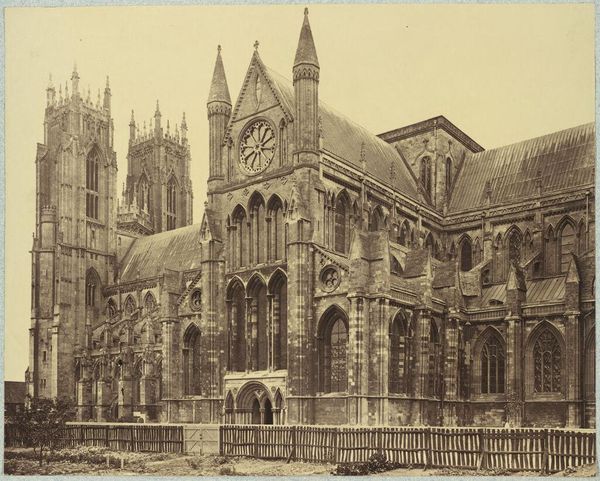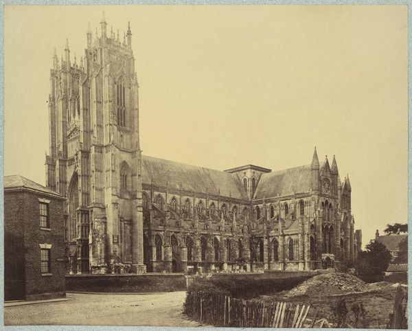Editor: This sepia-toned print captures Beverley Minster in Yorkshire, by Frederick Christian Lewis. It feels so grand, almost intimidating in its scale. What strikes you most about this piece? Curator: Well, the sheer act of capturing such detail is impressive. The delicate etching mirrors the Minster's own aspiration, reaching towards heaven. I see light and shadow dancing across the stone, almost breathing life into it. Editor: Breathing life... I like that. It’s more than just a building then? Curator: Indeed! Consider the figures in the foreground. Tiny aren't they? But they’re essential; they remind us of our place in the world. What do you think? Editor: I see what you mean! It puts everything into perspective. I’ll never look at architectural prints the same way again. Curator: Isn't that the joy of art? Shifting perspectives, one artwork at a time.