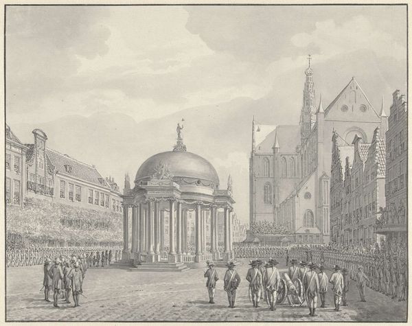Curator: Here we have Vincent Jansz. van der Vinne's engraving, "Beëdiging van het Regeringsreglement op de Grote Markt te Haarlem, 5 september 1787," created in 1787. Editor: My first thought is how eerily calm this busy scene feels. The muted grays create a somber tone. Curator: Indeed. Note the precise linework typical of neoclassical prints. Van der Vinne meticulously renders the architectural details and the crowd gathered in the Grote Markt. Editor: But who are these neatly arranged people, and why are they here? It speaks of control and order, yet feels on the precipice of something more. Curator: This engraving documents a pivotal historical moment, the swearing-in of the new government regulations in Haarlem. The regulations shifted power, marking a significant moment in Dutch political history. The print illustrates the ceremony with that grand pavilion at its center, symbolizing power and governance. Editor: Exactly! That's where it becomes interesting. These are not just neutral citizens observing; their rigid formation underscores the imposition of order, erasing individual narratives in favor of collective compliance. The etching reveals tensions between liberty and control, citizen and state. The limited palette suggests a silencing. Curator: Yet, the architectural structures give the piece a strong sense of balance. Look how the horizontal lines of the buildings are contrasted by the vertical columns, which offer visual interest but maintain the scene's rigid composition. It's all very deliberately constructed. Editor: And consider the historical implications. Whose stories are left out? Whose voices were not represented in this so-called "governing" structure? This engraving unintentionally asks us to question power and representation. Curator: A fine reading. The engraving style focuses attention on formal order and idealized civic action, downplaying dissension or ambiguity. The artist presents what the government hoped to project at this moment. Editor: Well, the strength of such art lies in exposing those tensions – the unspoken undercurrents beneath the formal surface, which offers much insight into the power structures of that time. Curator: An astute reminder to always consider the work and the conditions that fostered it. Editor: Yes, because ultimately, that’s where art history gets interesting, in deciphering the dialogues across time and perspectives.