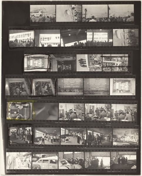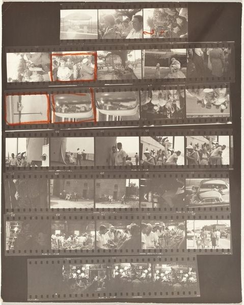 Editor: Robert Frank's "Hollywood 87", made in 1958, is a gelatin silver print showing a series of contact sheets. It almost looks like a storyboard. What is your interpretation of how the materiality and composition contribute to its impact? Curator: The gelatin silver print's tonal range is key here. The stark contrast enhances the granularity, lending a documentary-like authenticity to Frank's vision. The grid-like structure imposed by the contact sheets offers a fragmented narrative; sequences imply stories but resist a singular reading. Consider the visual weight: darker areas and strong diagonals versus the more open areas – how do these compositional choices influence the reading of the artwork? Editor: That makes sense, I see how the contrasting darks and lights really pop and how our eyes bounce around the images trying to form a coherent idea. The format really emphasizes the “everyday life” aspect of the scenes that are pictured, but do you think it feels incomplete by design? Curator: Precisely. Its formal qualities create an intentional dissonance. Each frame exists both independently and as part of the larger mosaic. Do you notice any recurring motifs or compositional strategies across these frames that might hint at an overriding structure, or a "thesis," to this work? Editor: I hadn't noticed before, but all the shots include figures. The perspective varies from wide, almost landscape shots, to intimate, candid frames of people in groups or on their own. There is definitely something connecting the individual to the collective. It seems to emphasize the connection through simple actions and settings. Curator: Excellent observation. Frank invites the viewer to actively engage in constructing a subjective meaning based on visual relationships and rhythms, don't you think? The photographic method here becomes the message. Editor: I see what you mean. This conversation has helped me consider the fragmented nature of the photographic contact sheet as a compositional choice in itself, inviting us to explore a multifaceted narrative rather than a linear one. Curator: And for me, it is a helpful reminder that Frank challenges conventional notions of photography, inviting viewers to construct their own narratives through visual associations.