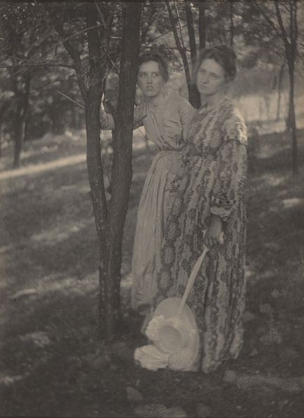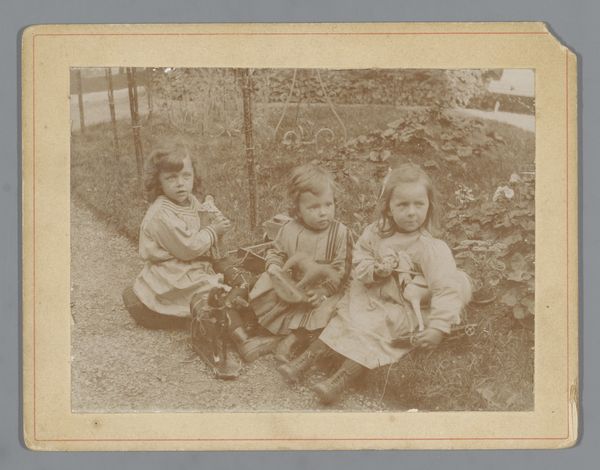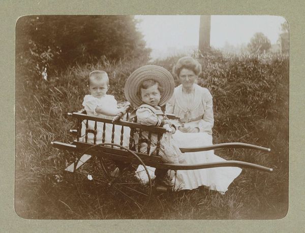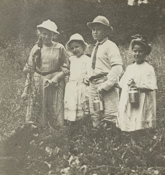 Editor: This lovely photograph, taken around 1910 by Henry Pauw van Wieldrecht, is called "Three children of the photographer (Renée, Irène and Sacha) with their 'undernurse' Daisy in a forest." The textures of the dresses and the hammock are striking. I'm curious, what resonates with you when you look at it? Curator: It's more than just a photograph, isn’t it? It’s like a faded dream, a window into a different world. Pictorialism was about creating an artistic image, not just documenting reality. The soft focus lends the photograph a dreamlike, almost ethereal quality. Did you notice how they're arranged, the children and their nurse? It’s staged, theatrical, like a tableau vivant. Editor: Definitely, I was thinking about that... especially how close they are. But it doesn't quite have a formal feeling, not quite... Curator: Indeed. And I suspect that blurring, that lack of precise definition, might actually hint at intimacy rather than formality. It speaks volumes. What I wonder about most is their future - or ours. These families often felt invincible in their moment, the very air around them so prosperous and promising. Yet, here we are now, peering back at them from a future they never saw coming. Tell me, what's your read on Daisy’s face? Does she feel part of this little world? Editor: That's a beautiful way to frame it. To be honest, I hadn’t even focused on Daisy specifically, but now that you mention it, she does seem slightly apart from the others, which changes the mood significantly. Curator: It’s like a fleeting memory caught on film, both beautiful and poignant. It's got me wondering who took care of them during the actual war, when all their family riches would disappear. Editor: Absolutely. This makes me think differently about the power of photography, especially portraiture. It's a portal and an interpretation.