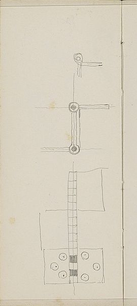 Cornelis Vreedenburgh created this sketch, titled "Studie," with pencil on paper. The most striking aspect of this drawing is its stark simplicity, with minimalistic lines sketching out a scene that hovers between representation and abstraction. The composition is sparse, with the majority of the page left intentionally blank, drawing attention to the few lines that are there. These lines form the basic structure of what appears to be a waterfront scene, rendered with such economy that we are left to fill in much of the detail ourselves. This technique invites us to engage actively with the artwork, projecting our own interpretations and experiences onto the scene. The texture of the paper is subtly visible, adding another layer of depth to the drawing. Ultimately, "Studie" encourages us to contemplate the essence of form and representation, and to consider how little is needed to evoke a sense of place and space.