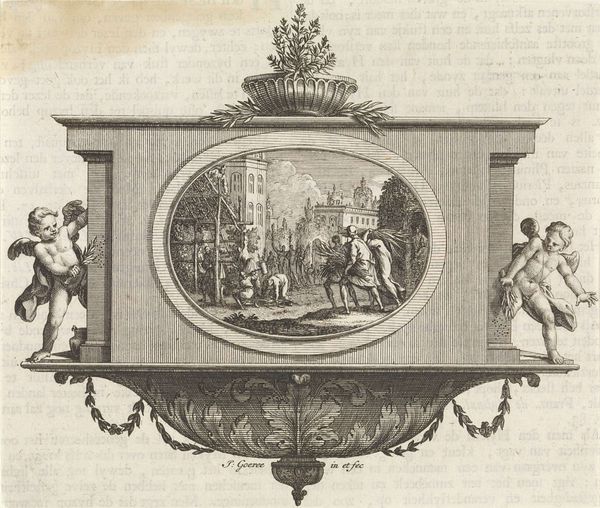 Editor: This engraving, "Monument voor het Vaderland" from around 1800, by Ludwig Gottlieb Portman, feels like a stage. There are all these different scenes framed, almost like acts in a play. How do you interpret the visual language used in this print? Curator: The whole piece reverberates with symbolic weight. It's a testament to Dutch patriotism cast through a Neoclassical lens. Look at the framing – the columns, the drapes – they echo theatrical devices, yes, but also the architecture of power, evoking Roman triumphal arches and temples. Notice how each framed vignette contributes to a collective memory. We're not just seeing history, we're seeing its construction, its presentation as a unifying narrative. Editor: So, these scenes aren't just factual depictions? Curator: Precisely. They’re carefully chosen emblems meant to trigger an emotional response – pride, unity, sacrifice. The naval battles, the heroic figures… they serve as archetypes, reinforcing an idealized national identity. Think about the light, too. It radiates outward, almost as a divine endorsement of the Dutch Republic. What feelings does that evoke in you? Editor: It does feel deliberate, staged, almost…propagandistic. But, is it effective? Does all this symbolism actually create a shared sense of identity? Curator: That's the question, isn't it? Does the weight of historical imagery crush or coalesce? Consider the repeated motifs, these carefully constructed visual echoes meant to resonate across generations. Their success lies not just in their aesthetic appeal but in their psychological impact, in how they burrow into the cultural memory. Editor: I never thought about engravings carrying so much ideological baggage. This has definitely changed how I see prints from this era. Curator: Indeed. Visual symbols speak volumes if you learn how to listen. They whisper of continuity, of power, of deeply ingrained beliefs.