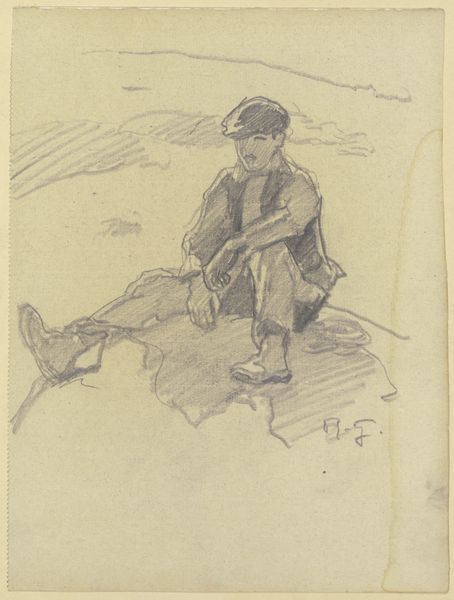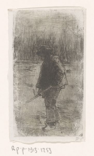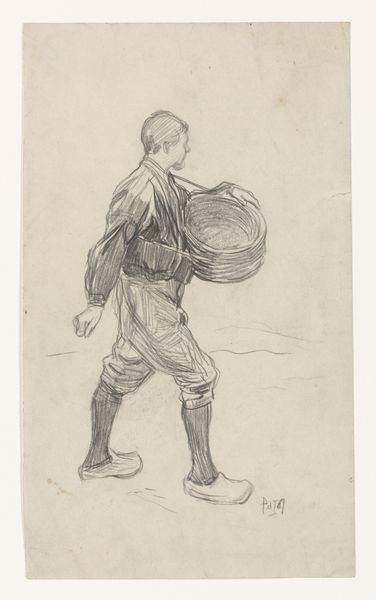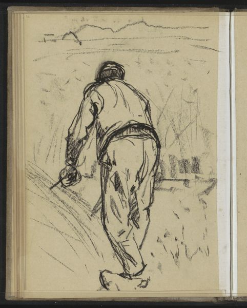 Editor: So, here we have George Hendrik Breitner’s "Grondwerker," made in 1897. It looks like it’s done in pencil and charcoal, and the figure seems so solitary, just standing there. What strikes you most about this piece? Curator: Immediately, I’m drawn to the subject – a manual laborer. In the late 19th century, depictions of the working class were becoming more common in art, reflecting broader social and political changes. Consider the rise of socialist movements and increased awareness of the lives of ordinary people. Editor: So you think the painting is meant as some sort of commentary? Curator: Perhaps, or simply a reflection of Breitner’s engagement with modern life. Breitner was known for capturing scenes of Amsterdam and its inhabitants. He wasn't alone, artists started moving away from romanticized portrayals of landscapes. The focus shifted to urban scenes, the grit, the labor, all components of contemporary society. Think about how artistic patronage was also evolving; there was a growing middle class interested in seeing their world represented. Do you notice anything about his posture? Editor: Yes, with his hands on his hips, he almost seems defiant, though his turned back makes it hard to read his mood. Curator: Exactly! Consider then how this imagery might resonate within the wider societal context, perhaps mirroring a burgeoning working-class consciousness or perhaps just Breitner portraying people around him. I would also want to consider who was likely to be a viewer of the work, what their beliefs might have been. It certainly can’t be viewed in isolation from these contextual concerns. Editor: That's a really interesting point –thinking about who the audience was. I never thought of it like that. It completely changes the way I see this now. Curator: Precisely! Art exists within, and is shaped by, social, cultural, and institutional forces. To grasp it more fully we need always ask ‘who, what, when, how and why?’.