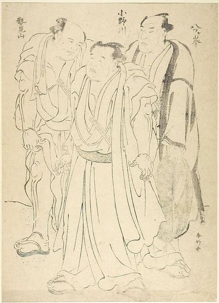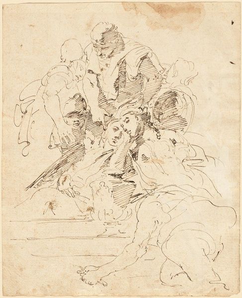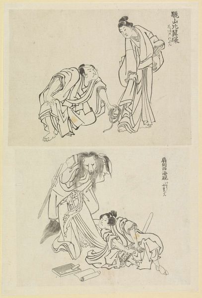 Editor: So, this is Tsukioka Yoshitoshi’s "Chūjōhime," an ink drawing from around 1875-1885. It feels like we're peering behind the scenes somehow, catching the artist in the middle of creating this narrative. What strikes you most about it? Curator: Oh, that unfinished quality hums with potential, doesn’t it? It whispers secrets about process and intent, like catching a glimpse of a magician before the grand illusion. I see the tension between vulnerability and strength – the poised vulnerability of Chūjōhime, kneeling in prayer, contrasted by the sharp resolve in the swordsman’s stance, sword, and bare feet. What’s *he* so troubled about? Is it about life and death? A rescue mission? Editor: I hadn’t thought of it that way, but now I'm seeing that contrast much more clearly. Is this typical of Yoshitoshi's narrative work? Curator: Absolutely. Yoshitoshi's art frequently delves into the shadowy depths of the human spirit and society itself, and often portrays tormented souls on journeys toward enlightenment. Here we find not just figures, but symbolic representations wrestling with inner demons. Yoshitoshi loves revealing these types of moments; these fragile transitions into grace. What do *you* suppose is happening in their untold story? Editor: Hmmm... maybe he is protecting her, in some moment of crisis where she kneels to seek strength from beyond? Or maybe she is interceding in his act? Thanks to your interpretation I am viewing it now in a brand new light. I'll remember to keep my eyes peeled for the moments of transitions and untold stories in Japanese drawings and prints! Curator: It's all a grand tapestry of interpretations. What a fun detective adventure! I love how each of us fills in the blanks!