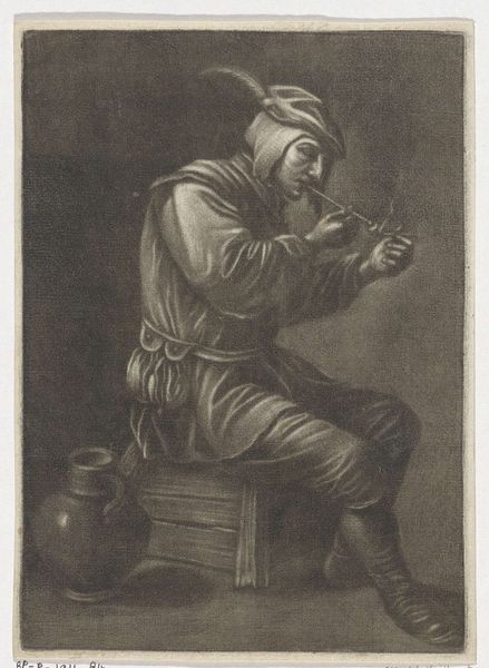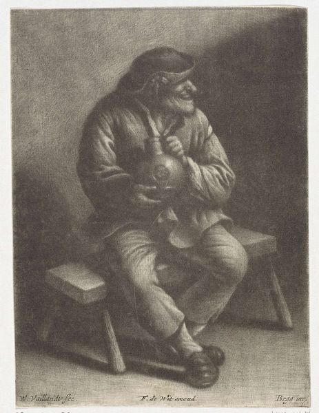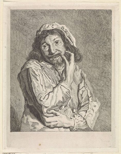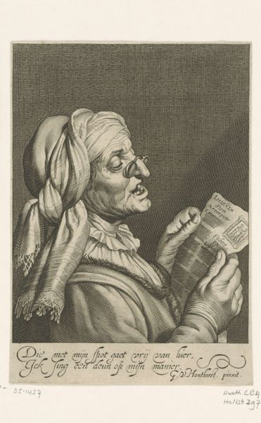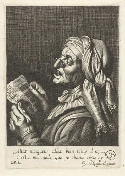 This is 'Oude vrouw met boek', made by Jan Matham around the mid-17th century, using the technique of engraving. It’s a powerful image, rendered entirely through the deliberate action of a hand using a tool, cutting into a copper plate. Look closely, and you'll notice how the density of the lines creates the shading and texture, defining the folds of the woman's headdress, the wrinkles in her face, and the pages of the book she holds. Consider the time and skill involved in such a process. Every line is a decision, a mark of labor that contributes to the overall composition. This wasn't a quick sketch, but a carefully constructed image, reflecting the cultural values around craft and artistry, where time-consuming techniques were highly valued. Matham’s print also reflects a wider context of labor and class. While he may have belonged to a more privileged class than the older woman in the image, his artistic practice was itself a form of work, demanding dexterity, patience, and dedication. The focus on materials, making, and context invites us to appreciate the artwork beyond its aesthetic value, to acknowledge the labor invested in its creation, and to question traditional distinctions between fine art and craft.