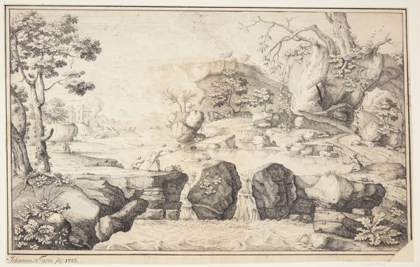 This landscape with two figures was etched by Reinierus Albertus Ludovicus baron van Isendoorn à Blois, sometime in the 19th century. The medium is relatively modest – ink on paper – but the effect is rich. Notice how the incised lines vary in depth and proximity. These give a full range of tones, conjuring up the rough texture of the rocks and the soft foliage of the trees. Etching has a long history, dating back to the middle ages, when the technique was used to decorate armor. By the 19th century, it had become a favorite method for artists to make multiple copies of their work, and circulate them widely. Seen in this context, the image of two men in conversation takes on a particular resonance. It's as if the artist is showing us how ideas, like etchings, can be passed from one person to another, and spread far and wide. The landscape itself becomes a metaphor for communication, with its open spaces and winding paths suggesting the many routes that ideas can take.