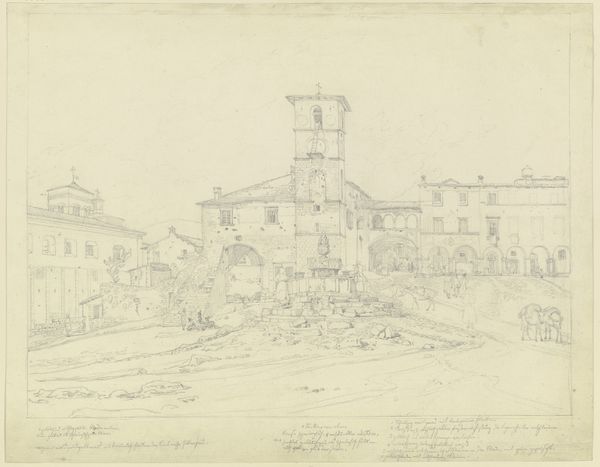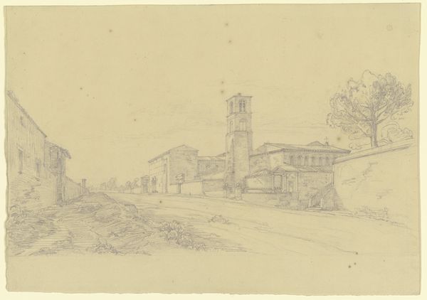 Curator: At first glance, there's something inherently fragile and intimate about this cityscape—or perhaps, church-scape? Editor: It is quite delicate, isn't it? What we're looking at is "Sant’Agnese fuori le mura in Rom," a drawing in pencil and etching on paper created between 17-1828 by Friedrich Maximilian Hessemer. Curator: The fragility I sensed must stem from Hessemer’s almost ghostly use of line! The architectural details waver like memories, rendered in the faintest of strokes. Editor: Notice the subtle choices he makes—the way the stairs ascend toward the basilica, or how the sparse foliage gives a feeling of timeless solitude. The image really resonates with those familiar historical markers that speak of devotion and pilgrimage. The Basilica of Sant'Agnese, as depicted here, has been venerated for centuries. Curator: Almost like he’s gently pulling this sanctuary from the ether. But there's also such a strong grounding in architectural form—that bell tower is unwavering. And look how solid he’s made those rooflines. It suggests something more than just physical, doesn’t it? Like a kind of eternal witness. Editor: Definitely. Consider the symbolic heft carried by Agnes herself, a figure of unwavering faith. It speaks volumes about human perseverance within this specific cultural tradition. Each line reflects an intention. The basilica becomes a representation not just of the religious space but the entire idea. Curator: Yes! And with its imperfections—that subtly skewed perspective of the path for example—it gains an authenticity that more polished renditions would have lacked. The soul of a space somehow captured in humble marks upon paper. Editor: Hessemer's sketch evokes a sense of reflection through a journey in devotion, and I really like its lasting testament, which bridges architectural rendering with emotive resonance, all rendered with sparse yet suggestive details. Curator: For me it underscores how deeply personal the act of truly *seeing* a space can be – almost as if Hessemer wanted to share a secret Rome with us, hushed and hallowed.