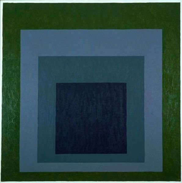 Josef Albers made this oil on masonite painting, Homage to the Square, playing with colour relationships using a very simple form. He was all about process and exploration and you can see how each layer interacts, it's not just a flat surface. Look closely, and you'll see how he's layered thin glazes of paint, almost like watercolour, to create these subtle shifts in tone. It's fascinating how the texture of the board peeks through, adding this quiet, almost imperceptible hum. Notice how the turquoise square seems to glow from within because of the greens surrounding it. It's like he's found a way to trap light and make it vibrate. Albers' work reminds me a bit of Agnes Martin, both artists obsessed with the grid, but in totally different ways. Albers wants to know how colors speak to each other and how we interpret those conversations. There's no fixed meaning here, just endless possibilities.