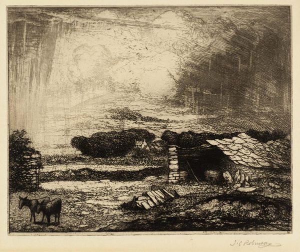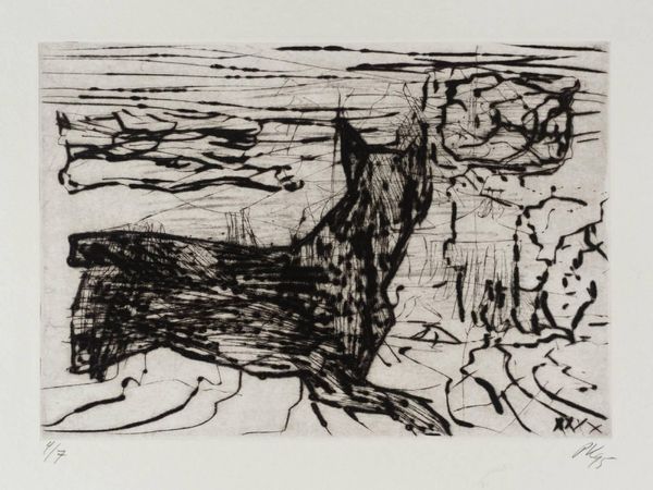 Editor: This is Leon Kossoff’s "Salisbury Cathedral from the Meadows (2)." The scene, rendered in strong, dark lines, feels both familiar and unsettling. What symbolic weight do you think the image of the cathedral holds here? Curator: The cathedral, often a symbol of stability, is engulfed by gestural, almost chaotic lines. It evokes a sense of memory – not a clear, pristine recollection, but one weathered by time and emotion. Do you see how it is framed by the arch of the rainbow? Editor: Yes, I see that, and it almost feels like it is being swallowed by the landscape! Curator: Exactly! The rainbow itself, traditionally a symbol of hope, here feels almost like a looming presence, a bridge not just to the divine, but perhaps to a more complex, even threatening future. Editor: I never would have looked at the rainbow that way, I like that the hope could be seen as uncertain. Curator: Considering Kossoff's background, the weight of the cathedral as a cultural and emotional symbol seems intentionally complicated.