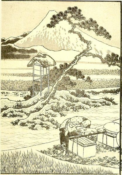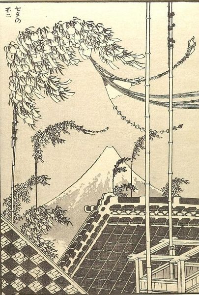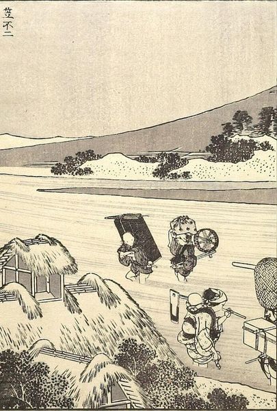 Curator: This image, "Fuji in Asumi Village," is a detached page from Hokusai's series, "One Hundred Views of Mount Fuji." It's a woodblock print, showcasing the artist's masterful use of line. Editor: The clustered composition initially feels claustrophobic. The thatched roofs dominate, overshadowing the human figures. Curator: Thatched roofs have long symbolized rural life and community, deeply ingrained in the Japanese psyche. Hokusai uses them to frame Fuji, a symbol of national identity and spiritual significance. Editor: But Fuji is so faint, almost obscured! Perhaps it suggests how daily life, the weight of the mundane, often obscures grand ideals. The figures are small, ordinary people living under that iconic shadow. Curator: The print exemplifies how Hokusai frequently situated Mount Fuji within the everyday lives of ordinary people, thereby grounding a sacred symbol in the reality of the era. Editor: It's a powerful reminder of how national symbols coexist with—and are shaped by—the lives of the populace. A poignant contrast.