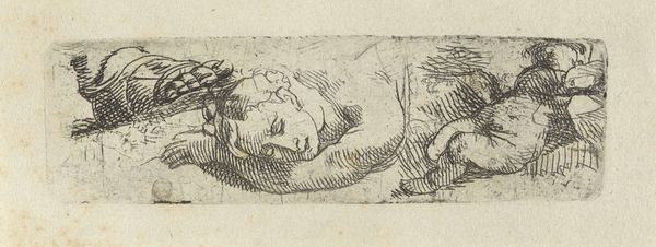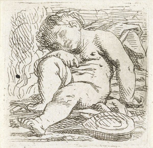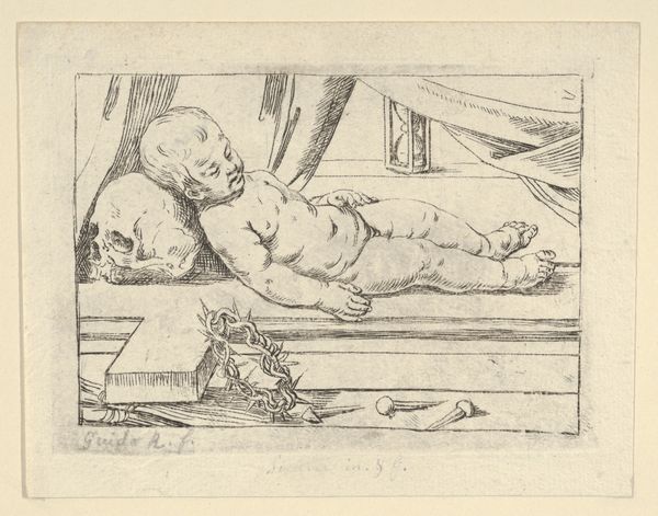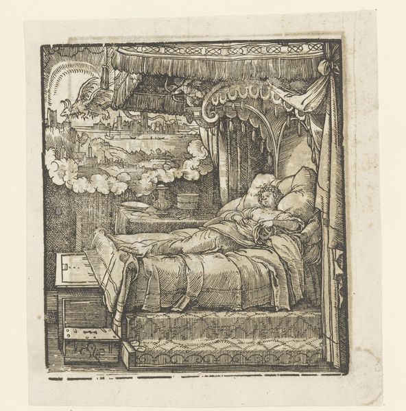 Editor: This ink drawing, titled "Tobits blindheid" by Dirck de Bray, dates back to sometime between 1635 and 1694. It depicts an interior scene with a sleeping figure. It has quite a simple composition but, what strikes me, is that within this small scene, there's another scene through the archway... almost like a dream. What do you see in this piece? Curator: It is the dream! Look closely – Dirck de Bray is using the angel figure as more than just an angel. Angels operate as powerful cultural symbols, linking the mundane world to the divine. But notice how the figures beyond the arch appear flattened, almost like figures from a memory, distinct from the immediate reality of Tobit's slumber. What do you think is suggested by depicting them with such differing visual languages? Editor: Well, if the sleeping figure is Tobit, then could this flattened style be referring to his blindness? And therefore representing how he sees, or rather *doesn’t* see the world? Curator: Precisely! The dream, a common visual trope, carries heavy symbolic weight. Consider the objects within Tobit’s 'real' space: the hammer suggests physical labor, earthly existence. But the bird perched above? What cultural connotations does that creature hold? Editor: A sense of freedom maybe, or perhaps even prophecy, given its position above him? Is de Bray inviting us to consider a larger narrative, one beyond immediate perception? Curator: I believe so. By juxtaposing symbolic imagery and differing artistic styles, he builds a visual memory palace around a single, significant moment, enriching its depth. Do you find this encourages a shift in how you perceive the work? Editor: Absolutely. Seeing how de Bray uses this symbolic language makes me appreciate the piece more deeply than I initially did. Curator: Me too. It reminds us of art’s incredible ability to evoke complex layers of meaning even through seemingly simple forms.