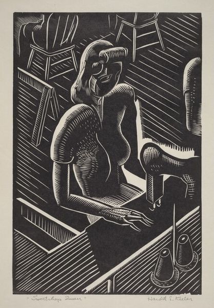Ralph Austin created this print, titled "Girl Writer," using an unspecified medium, with a focus on form and tonal contrast. The composition is dominated by the seated figure, whose simplified, almost geometric forms are rendered with meticulous stippling. This technique creates a velvety texture and a subtle gradation of light and shadow, evoking a sense of contemplative stillness. The figure's pose and the presence of the book suggest intellectual engagement, but the stark, reductive style complicates any straightforward interpretation. Austin uses the interplay of light and shadow to define the figure's contours and create a sense of volume. The areas of light that delineate the shape add depth. This strategic use of chiaroscuro not only sculpts the figure but also draws attention to the formal qualities of the composition, emphasizing the balance and harmony of shapes within the artwork. The reductive forms and tonal range invites us to consider the artwork's formal structure and materiality as a source of aesthetic and conceptual meaning.