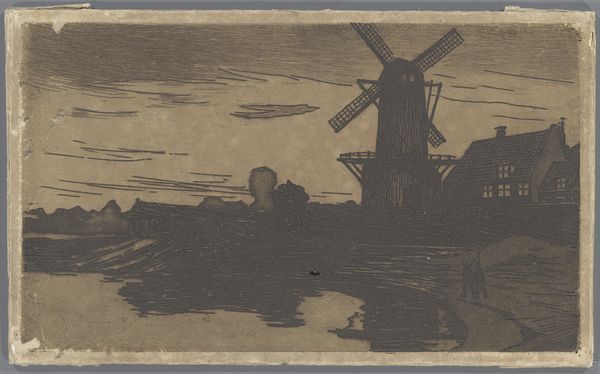 Curator: Today, we are looking at a piece called "Molen" created in 1930 by Louis Cardinaals. It's a woodcut print currently housed here at the Rijksmuseum. Editor: Immediately, I am struck by the contrast. It's almost entirely black and white, creating a starkness that really emphasizes the texture of the wood grain. There's something both imposing and intimate about it. Curator: That contrast is quite deliberate, characteristic of the Dutch Golden Age revival this work alludes to. The public role of the Dutch windmill in Cardinaals’ era speaks volumes about the relationship between the Dutch identity, land control, and technological progress of the time. Editor: Absolutely. You can’t ignore the political dimension here. Historically, windmills were vital pieces of infrastructure; it becomes symbolic of both the power to shape nature, and the working-class labor that goes into harnessing that power. Curator: I would like to add that printmaking has a very strong connection to political discourse; and indeed to revolution. This artwork is not overtly protesting, but Cardinaals is situating this landscape tradition within the radical technology of reproduction that prints facilitated. Editor: Do you think there's any connection to the historical representation of women working with the windmill as sort of almost allegorical for motherhood in particular? Does it appear in this depiction? Curator: Well, it's subtle here. The composition focuses predominantly on structure and mechanical labor, not denying female labor or even representation, but rather drawing a clearer link to tangible actions rather than strictly a gendered sphere. It might be reaching to extract that representation here. Editor: Maybe. But consider the scale. Though small, "Molen" evokes so much emotion through that simplicity. It’s quiet but resolute. And the way it reduces everything to pure form emphasizes our own active looking process: it calls attention to the political nature of observing landscapes itself. Curator: Exactly! Art shapes not only perceptions of landscapes, but public attitudes toward their preservation and conservation; and Cardinaals definitely touches on that very long history. Editor: Yes. It really brings to light the connection between technology, labor, and also our responsibility to both heritage and sustainable futures. Curator: I appreciate how you’ve linked so many narratives present within the work! It has been delightful to have another lens with which to look at this work. Editor: Thank you for sharing the work with me, I now see more meaning than I would on my own, and this conversation opens so many opportunities for how it impacts a modern sensibility, thank you.