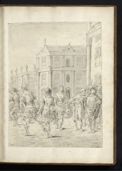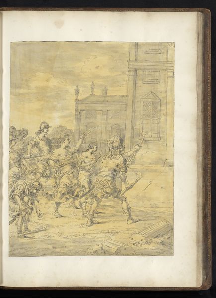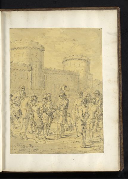 Editor: This ink drawing, "Alexander the Great Visits Diogenes of Sinope," was created by Leonaert Bramer around 1655-1665 and is currently at the Rijksmuseum. The scene has a somber mood with complex architecture in the background contrasting with Diogenes in his barrel. What's your take on this particular piece? Curator: What strikes me is Bramer's rendering of the encounter through the lens of labor and societal roles. Look at the materiality of the drawing – ink on paper, a relatively accessible medium, yet deployed to depict a scene rife with social stratification. We see the material trappings of power in Alexander's entourage: their garments, their horses. Diogenes, in contrast, is presented with a calculated austerity, stripped bare. Editor: That's a good point! I hadn't considered the materials in contrast like that. Curator: Consider, too, the labor involved in producing such an image during that period. A drawing like this served not only as a narrative but as a portable commodity, disseminating ideas and social commentary within a specific marketplace. And look at the paper itself, likely made using labor that Bramer maybe wanted us to reflect upon through the depicted story. Does understanding the probable original purpose add more weight to the philosophical meaning, do you think? Editor: That definitely reframes my understanding. Knowing that the drawing served as a form of social currency shifts the focus from simply the philosophical exchange to the mechanics of power and how art can reflect and perpetuate or maybe even undermine them. Curator: Precisely. The materiality and means of production become inextricably linked to the message being conveyed, offering us a richer understanding of Bramer’s critique. Editor: I learned so much about materiality and social stratifications, seeing them through a new perspective. Curator: Indeed, analyzing art with consideration of material culture creates fascinating interpretations.