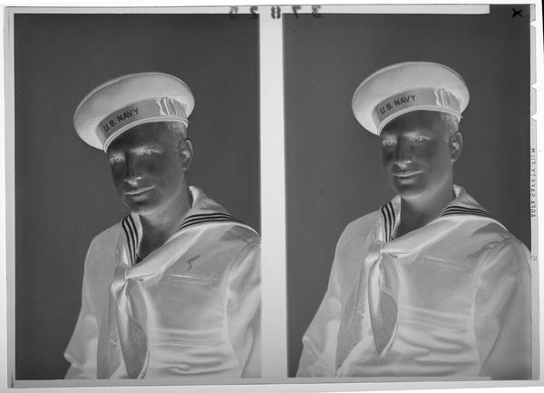 Editor: Here we have an Untitled double portrait by Martin Schweig. What strikes me is the way the negative space gives the subject an almost ghostly presence. What symbols or meanings do you see embedded in this image? Curator: The doubling itself is significant. The woman is depicted twice, side by side, which can symbolize duality, reflection, or even a split identity. The flower pendant could represent femininity, but its specific meaning would depend on the type of flower and its cultural associations. Editor: Interesting. So, could the duality also suggest inner conflict or perhaps a multifaceted personality? Curator: Precisely. And in a studio portrait, the very act of posing becomes a symbol of self-presentation and the negotiation between the inner self and the outward image one wishes to project. Editor: This has given me a new perspective on portraiture. Thank you! Curator: My pleasure. Exploring these layers is key to understanding any portrait.