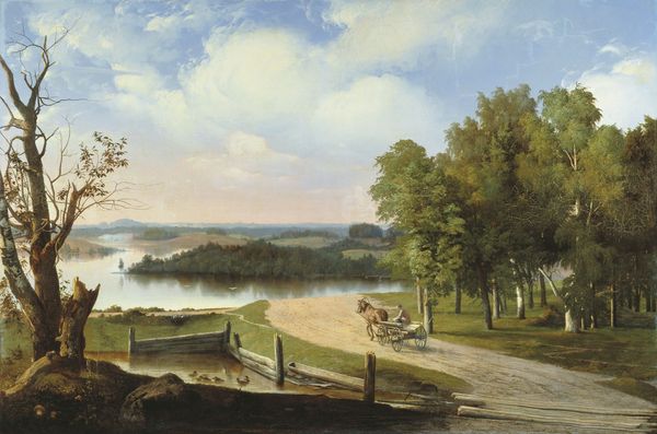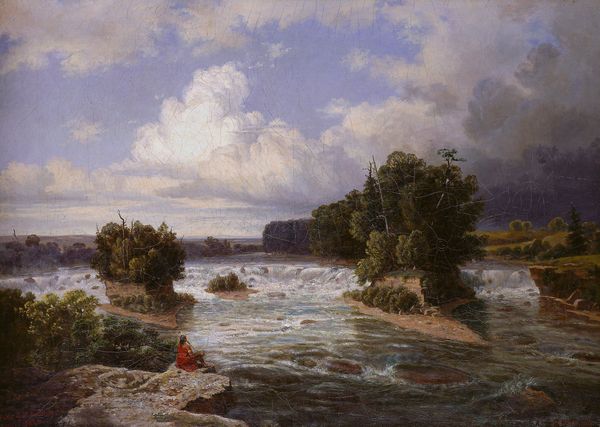 Seth Eastman painted *The Falls of St. Anthony* with oil on canvas; its relatively small scale draws the viewer into a detailed observation of the natural scene. The composition is structured by the cascading waterfall in the middle ground, flanked by the riverbanks, with the horizon line cutting across the upper third of the canvas. Eastman's brushstrokes vary from smooth and blended in the sky to more textured in the depiction of the rocks and water. The painting uses a play of light and shadow, which articulates the forms. The contrast between the churning water and the static landscape introduces a tension between movement and stillness, chaos and order. This visual tension reflects broader philosophical concerns about nature: is it a sublime force beyond human control, or a scene to be surveyed and mastered? Eastman’s work presents us with a landscape that is both picturesque and dynamic, prompting us to consider our own position within the natural world and our engagement with its ever-changing forms.
