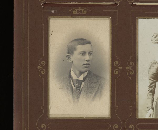 Editor: Here we have “Portret van een jonge man,” a gelatin silver print photograph, sometime between 1881 and 1903. The way he’s posed and framed reminds me of formal portraits from a bygone era. What feeling or ideas does this portrait spark in you? Curator: This photograph carries within it echoes of late 19th-century society, when portraiture was becoming increasingly accessible, democratized through photography, yet still clinging to the established visual language of painted portraiture. The young man’s attire – the high collar, dark jacket, the carefully knotted tie – these are visual markers of bourgeois respectability and aspiration. Do you see the tension in his gaze? Editor: Yes, I see what you mean about the gaze. There is something serious, maybe a little unsure about it. Curator: Precisely. His gaze is direct yet somewhat hesitant, and I think that communicates something about the sitter's internal state, perhaps a self-consciousness common to youth but also reflective of the era’s emphasis on presenting a proper image to the world. Consider how photography, at this time, became crucial in shaping personal and collective memory. What stories do you think portraits like this one were meant to tell? Editor: That it’s interesting, maybe about projecting a certain image of self to create legacy for their family and generations to come. The way they presented themselves was carefully planned. Curator: Exactly. Every element, consciously or unconsciously, communicates values, beliefs, and anxieties. The image becomes a carefully constructed representation of identity and aspiration embedded within a specific historical context. Editor: That's a fresh way of considering this photographic print, and how constructed that sense of self can be. Curator: Indeed, and exploring such elements opens pathways to understand the individuals, values, and collective memories of that era. Editor: It all makes me think differently about portraits now. Thanks for illuminating that for me!