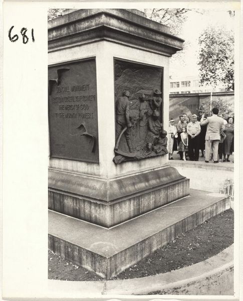 Curator: What a strangely compelling image. It feels like a graveyard of artistic ambition. Editor: Indeed. The Rijksmuseum holds this black and white photograph, titled "Vernield beeld van de toneelschrijver Herman Heijermans," which translates to "Destroyed statue of the playwright Herman Heijermans." Its date is estimated between 1940 and 1966. What strikes me is the sheer sense of abandonment. Curator: Precisely. You see the toppled fragments, the disjointed head, the carved name looming behind it all. Heijermans was a significant figure, a playwright known for his social dramas, so to see his monument in this state speaks volumes about the mutability of fame and remembrance. It has a strong sense of iconoclasm, doesn't it? Editor: It does. It makes one consider how political winds shift, and how public figures, once celebrated, can fall from grace, sometimes even to the point of physical desecration. Who was it that documented this fallen statue? The story behind the lens might reveal why and when it happened, but also how it reflects back upon society at large. The destruction and subsequent record seem important. Curator: We can perhaps imagine multiple layers here. First, there's the initial act of vandalism, suggesting a rejection of Heijermans' values or perhaps even a broader cultural upheaval. Then, the photograph itself acts as a form of preservation. The image is presented in grayscale which renders an objective feel in documentary aesthetics, as if to archive some cultural decay that once was considered precious and worthy of memorializing. Editor: The composition only amplifies this tension, in my view. The fragmented statues appear almost discarded, mixed with building materials behind the towering stele and the artist's name engraved upon its frontispiece. The bust looks disfigured, as if screaming into nothingness! Curator: It almost suggests a sense of collective amnesia. What was once celebrated is now broken and forgotten. The image offers a silent commentary on the impermanence of glory, prompting us to contemplate which ideas will triumph and the narratives our monuments convey to posterity. The visual is extremely potent for doing that in just one capture! Editor: Agreed. This photograph is an interesting testament to time's passage, to how readily the symbols we create can be overturned and reinterpreted with different meaning. Curator: Indeed, and what a fitting visual emblem of how histories can be rewritten through various iconographies and cultural attitudes.
