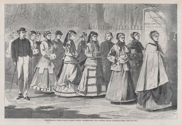 Curator: Here we have Winslow Homer's "New York Charities – St. Barnabas House, 304 Mulberry Street," a print dating from 1874. It appeared in "Harper's Weekly." Editor: It hits you with the weight of a world, doesn’t it? A contained, quiet world, but so many stories pressed onto the page in grayscale. It almost feels… biblical? Like an Old Testament illustration. Curator: The composition is divided into vignettes, creating a narrative tapestry of life within this charitable institution. Note how Homer uses line and shadow to articulate distinct spaces and psychological states. Editor: It's almost claustrophobic, this compression of different moments. And the figures… they seem so separate, contained in their own bubbles, even when clustered together. Except for that nun-like figure near the door. Her positioning brings me tranquility! She looks peaceful. Curator: The academic realism captures the somber atmosphere effectively, highlighting the social inequalities of the time. Each figure, though part of a larger group, is rendered with individual detail. Editor: It makes you wonder about their individual circumstances, doesn’t it? Who are these women? What brought them here? There’s such a strong sense of quiet desperation clinging to their clothes! I almost can hear the wind's echo around those figures depicted at the center. Curator: Homer is less concerned with idealization and more invested in documentary observation, which aligns with the principles of social realism that informed much of his work during this period. Editor: Still, there's a detached observation about the whole thing. Are we meant to sympathize or just... observe? It’s powerful stuff, hitting notes on social injustice as loudly as the 21st century still does! Curator: Indeed. Homer masterfully employs compositional strategies, such as the use of framing and varying figure groupings, to construct meaning and draw attention to the dynamics within this environment. The gaze, the postures… everything contributes to a sense of internal world. Editor: A silent symphony of hard choices. It feels weird knowing this once appeared in a magazine... Now I'll be thinking all day about the realities etched into its monochrome depths.