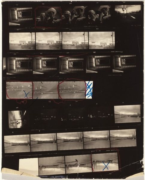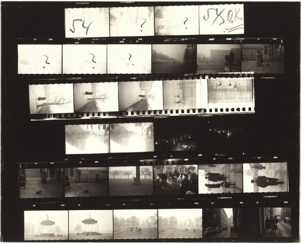 Editor: Here we have Robert Frank's "Valencia, Spain 12," a gelatin silver print from 1952. What strikes me is how the artist chose to present the full contact sheet, instead of just the isolated, chosen photograph. What does this format say to you? Curator: Well, immediately, it speaks to the materiality of the photographic process, doesn’t it? By showing the entire roll, Frank deconstructs the notion of the singular, perfect image. We’re confronted with the labor, the trial and error inherent in photography. Editor: That’s interesting. So it's about revealing the work that goes into it. Do you see this as commenting on the commercialization of photography? Curator: Absolutely. The consumer often only sees the final polished image. Frank presents us with the raw, unedited reality. It pushes back against the glossy perfection typically associated with photography that was made to be sold. It reminds us that images are produced, constructed, commodities even. How might this affect our view of 'truth' within documentary photography? Editor: I see what you mean. Seeing all the images together really shifts the focus to Frank’s own actions in making the photographs. It makes me wonder, what kind of camera was he using and how did that impact the style? Curator: That’s precisely the sort of question to ask! This close attention to the means of production shifts the understanding of authorship and artistic expression to the materiality and process, not merely on what the subject is in the picture. It seems Frank makes it more of how we should be looking at any artwork, I'd say. Editor: That’s a great point, thank you. I'll never look at photographs the same way again!