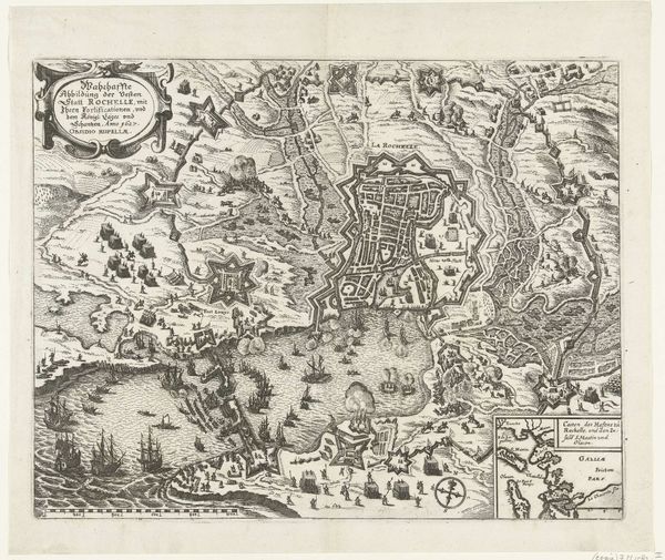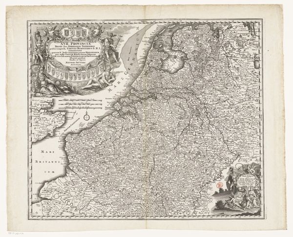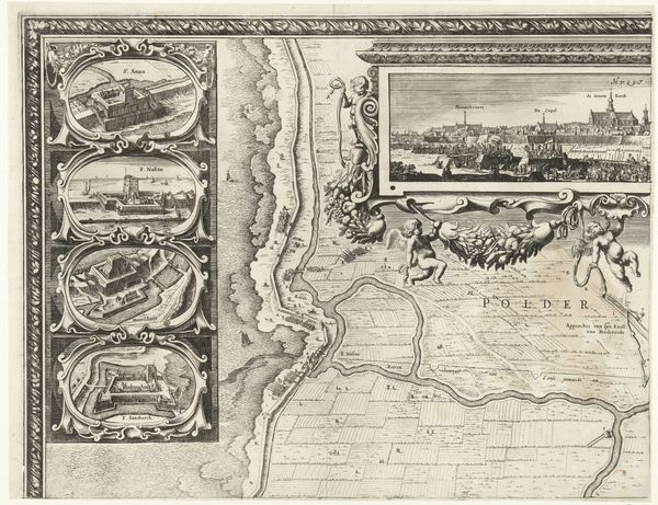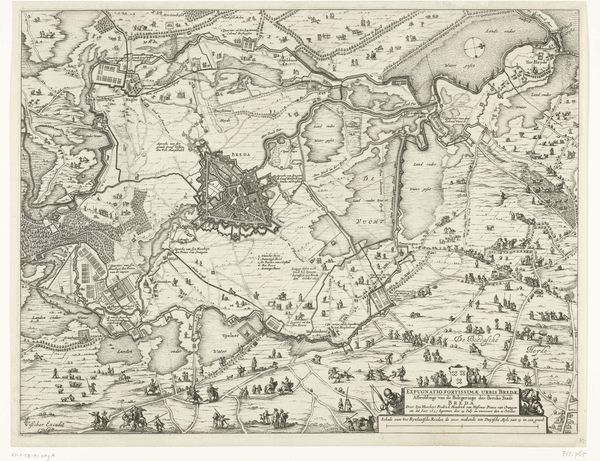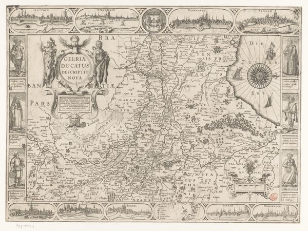 Curator: Stepping into the cartographic world, we encounter "Kaart van Israel en Egypte," a map of Israel and Egypt from around 1604, created by Pieter Bast. The medium here is engraving, a graphic print showcasing a fascinating landscape and historical perspective. What are your initial thoughts as you gaze upon this piece? Editor: Woah, it’s a whole little world encapsulated! Kinda feels like peeking into a time machine, right? I'm immediately drawn to how detailed everything is; I could just get lost wandering through all those tiny cities. Plus, there's this sense of old-world adventure seeping out of it, does that make sense? Curator: It makes perfect sense. Considering the historical context, these maps were not only geographical tools, but also reflections of power and knowledge. They functioned to portray the world as it was understood through a European lens at that time, reflecting colonial ambitions. Think of this representation of the ‘holy land’ as it impacted European perspectives. Editor: That definitely puts a new spin on things. The religious implications were clear in how precise this rendering is! Like they wanted to 'capture' a sense of sacred places. Curator: Indeed. Look closely at the borders surrounding the central map. Notice how they depict biblical scenes? It merges geographic depiction with biblical narrative. This combination solidified the link between the territory, faith, and European cultural identity. This reflects an early modern desire to both understand and control space. Editor: Ah, now I get it! It is both claiming ownership and trying to decipher what the land might represent or even hold for them as a collective. Almost like a visual manifesto, binding geography with destiny and their beliefs. Amazing how something that looks like a simple map can be so layered. Curator: Precisely. Maps are not neutral objects. "Kaart van Israel en Egypte" reveals much about the ambitions, beliefs, and socio-political power dynamics of its time. Understanding these intersectional narratives enhances our experience of the piece. Editor: I’ll say. It went from interesting image to a multi-layered symbol pretty quickly. I’ll definitely carry that sense of context with me now when looking at historical maps; thanks!
