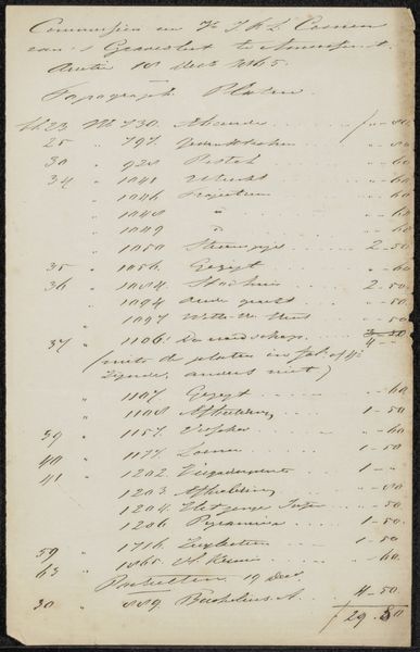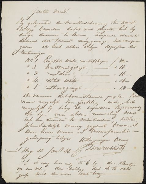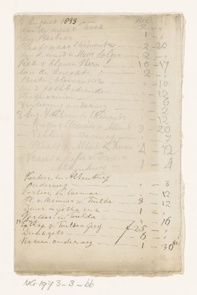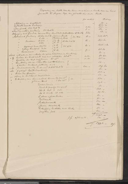 Curator: Alright, let's turn our attention to "Overzicht van de inkomsten die Willem V van de staat ontvangt, ca. 1775," or, "Overview of the income that Willem V receives from the state, around 1775." This anonymous drawing from the late 18th century is done in ink on paper, and is currently held at the Rijksmuseum. What's your first take on it? Editor: You know, it feels incredibly intimate, like stumbling upon someone’s personal ledger. All those handwritten figures fading into the paper… it's as if you’re peering directly into the financial soul of Willem V, with this slightly desperate scrawl trying to make sense of it all. Does anyone else feel that or is it just me? Curator: No, I get that completely. It’s fascinating how handwriting itself becomes a symbolic marker here. Each flourish, each tightly packed line of figures speaks to the weight of wealth, privilege, and maybe even anxiety about maintaining it all. The calligraphy style, in this context, suggests a tension between refined aesthetics and raw, practical accounting. Editor: Exactly! And I'm curious about these little blots and smudges. Each imperfection hints at a real hand at work, contemplating these sums. It makes you wonder about the unseen political and economic structures shaping his life. Who decided on these numbers, and how did they affect him? Curator: Absolutely. The hand-drawn quality pulls us into that specific moment in history. It feels like a raw, unedited document compared to a printed statement. I imagine those numbers representing everything from military expenses to personal allowances. Each carefully listed income source tells a silent story of power and governance. Editor: You're so right. We read about history, but to actually see it recorded in this almost anxious script... it's another level of connection. I get lost thinking about the clerks bent over their desks, illuminated by candlelight. Each digit feels pregnant with unspoken cultural implications. What a fascinating glimpse behind the curtain. Curator: Yes, absolutely. It really emphasizes the material reality of power, right? All those sums add up to something far more complex than just money—they represent an era and all its socio-political dynamics. Editor: Precisely! It reminds us how every single artifact, even seemingly mundane things like these income statements, has secrets waiting to be deciphered. Thanks for pulling this one to the forefront. Curator: My pleasure.