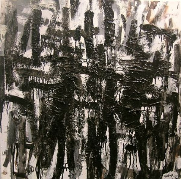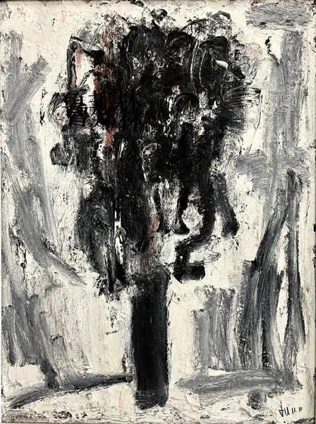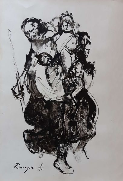 Curator: Right now, we're looking at an untitled work, mixed media drawing, dating to 1973, by Alfred Krupa. First impressions? Editor: Well, there's a somber quality. It reminds me of the aftermath of something...like looking at the skeletal remains of a city after a flood. Stark monochrome palette adding to that mood. Curator: The lack of color certainly heightens the drama. I see a layering of forms and figures, but more ghostly suggestion than precise representation. And yet, there is a man-shaped presence at the center. Editor: The way he's situated, dwarfed by those looming shapes, evokes a real sense of insignificance, but his silhouette echoes that of surrounding towering elements. It’s interesting that you describe him as 'man-shaped', since Krupa's forms hint at both architectural structures and human figures at the same time. Curator: It is like architecture infused with spirit, isn't it? And the dripped ink creates a visceral sense of erosion or the passage of time. This could easily represent the precariousness of memory, especially the ones which constitute traumatic episodes. Editor: Absolutely. Symbols can be really sneaky; often they’re felt before they are seen. That's what holds my attention in this image. Even without knowing anything about Alfred Krupa, this has a strong symbolic weight that conveys emotional heaviness. The linear work conveys raw power. Curator: Krupa lived through tremendous historical turmoil; being twice displaced, and losing many family members in WW2, he witnessed humanity's destructive potential firsthand. While 'untitled', I would bet he could never really name its emotion. What’s left to be named, after experiencing such great trauma? Editor: So, it is both a depiction of reality and, at the same time, a profound meditation on loss. Curator: A meditation which stays with you. Those ink washes speak volumes without needing a single concrete detail, whispering stories of both personal and collective pain. Editor: Yes, it gives a presence to what is missing, somehow...which is so potent. Thanks, this piece has lingered for me.