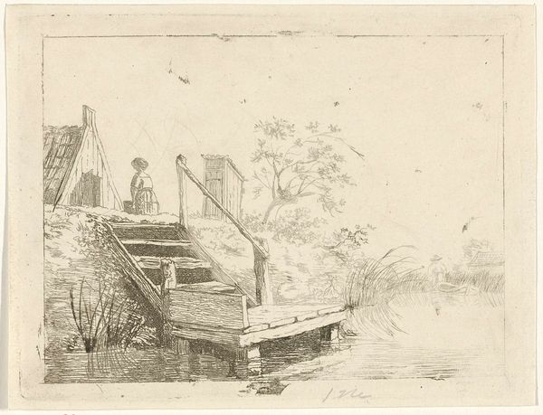 This landscape with a bridge was made by M. Massé using etching, a printmaking technique dating back to the 16th century. The process involves applying a waxy, acid-resistant ground to a metal plate. The artist then scratches an image into the ground with a pointed tool, exposing the metal. The plate is then immersed in acid, which bites into the exposed lines, creating grooves. Ink is applied to the plate, filling the etched lines, and the surface is wiped clean. Finally, the plate is pressed onto paper, transferring the inked image. The material qualities of the metal plate and the acid determine the depth and character of the lines. The process allows for fine detail and subtle tonal variations, as we can see in the delicate rendering of the vegetation and water. Massé's skillful manipulation of the etching process transforms humble materials into a tranquil scene. Appreciating the physical work and chemistry behind this etching helps us see it not just as an image, but as a product of skillful labor.