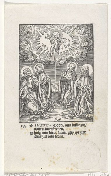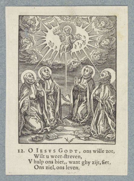 Curator: I find myself drawn to the contrasting textures in this print. There’s something immediate about its depiction of labor through material means. Editor: And, in fact, what you are responding to there speaks directly to the power this work embodies, especially given its context. We’re looking at “Vijf Heiligen” – “Five Saints” – by Michael Snijders, dating from after 1622. It’s an engraving, and it depicts, as the title suggests, five canonized individuals. Curator: Those dense clusters of lines give form to their robes. The artist really knew their craft. But who are these saints exactly, and why depict them as looking upwards at the dove above? Editor: Understanding that gaze is key. These are Saint Isidore, Ignatius of Loyola, Francis Xavier, Teresa of Avila, and Philip Neri. Their collective beatification by Gregory XV in 1622 united distinct historical moments across diverse geographical and ideological spheres within the universalizing project of the Catholic Church. Each figure faced particular historical exigencies which the church strategically wove into the fabric of its renewed self-image during the Counter-Reformation. Curator: Ah, yes, there’s something so staged and unnatural in how uniform their reverence appears; it makes one wonder about the conditions and context of their lives relative to the intentions here. Looking at it from a purely technical viewpoint, notice the variations in line thickness; what appears to be dark is no more than accumulations of tiny deliberate marks on a copper plate. It becomes incredibly subtle when observing the play of light. Editor: Exactly. The starkness lends an austere tone but reflects the broader societal tensions between artistic production and religious institutions following the Reformation. Furthermore, each saint comes with their unique symbolic baggage. Take Teresa, for example, her writing granted power by a male ecclesiastical body while also revealing possibilities within hagiography that provide glimpses into a woman's lived experiences in cloistered life. It is complex in terms of who can wield these narrative constructions to what purposes. Curator: So many of these choices reveal underlying aspects of art making! And ultimately a piece like this becomes a record of faith, devotion, and labor. I will remember the five figures facing skyward to greet whatever blessings might come. Editor: For me, it’s more a question of whose voices—and whose labors—become canonized over others through representational power; the print becomes another location to trace a specific vision of authority.