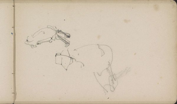 Curator: Here we have "Drie paarden," or "Three Horses," a pencil drawing on paper attributed to Anton Mauve, created sometime between 1848 and 1888. It resides here in the Rijksmuseum. Editor: Immediately, there's this fleeting sense of movement, or rather, impending movement. They're about to go somewhere. Or perhaps they're waiting... It’s beautifully understated, like a memory fading at the edges. Curator: Indeed. Mauve was part of the Hague School, and this drawing typifies their interest in rural scenes and the lives of working animals. It emphasizes realism and atmospheric effects. These studies were often precursors to larger paintings, capturing authentic Dutch life away from the grand narratives. Editor: Authentic, yes, but it's more than a simple record. Look at the sensitivity in those lines! Each one seems to breathe. There's a certain weight to the horses, a solidity. Yet it’s rendered with such lightness. Did Mauve labor on many drafts of such drawing, I wonder? Or did this all happen in a inspired frenzy? Curator: It’s hard to say definitively. Given that it's a study, one can imagine it was a process. But also, art academies have a heavy culture in favor of capturing quickly on the page one's vision in order to study different configurations that might inform a painting or other final work of art. What appears spontaneous and effortlessly truthful often involves careful observation and honing one's craft within those formal spaces. Editor: Perhaps both, a dance between instinct and intellect, yeah? I am just struck how those minimal lines conjure weight, the quiet strength. What is it, really, that goes into the image when you just render line over a blank canvas? Some ghostlike spirit. Curator: These depictions of horses were common, partly due to their utilitarian roles but also because equestrian subjects offered artistic possibilities – an embodiment of power harnessed to human effort and shaped and refined in aesthetic language. Editor: And now those beasts are rendered just by light sketch, captured, perhaps as a memento. We see them across time. Almost a bit haunting when you look at it that way. Curator: This exploration offers us a way into considering changing relationships to working animals, both in Anton Mauve's era and now in ours. Editor: Precisely, a reminder of connections. That's why such intimate drawings resonate—they invite us to pause, and maybe connect, as humans have always been doing.