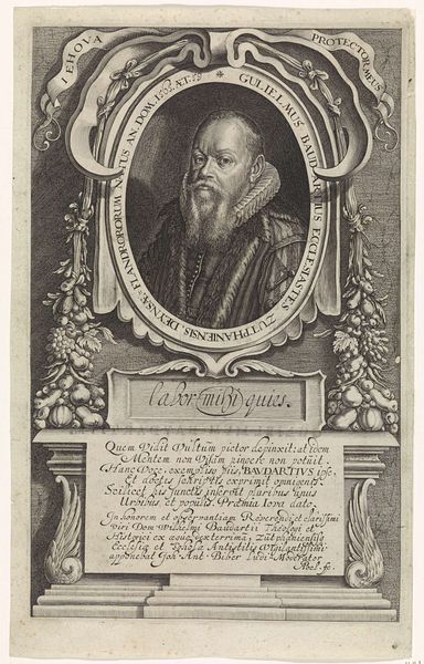 Editor: We're looking at a print from 1652 by Coenraet Waumans titled "Portret van August II de Jongere, hertog van Braunschweig-Lüneburg," at the Rijksmuseum. It’s incredibly detailed. How do you interpret the visual elements in this portrait? Curator: Let us begin with the frame itself. The ornate oval framing device, densely populated with symbolic figures, serves to both contain and elevate the portrait of August II. Note the tension created by the symmetry and asymmetry: the mirroring of the winged figures, horse and stag offset by the central heraldic shield above and the inscription below. Editor: So the frame is just as important as the portrait itself? Curator: Precisely. Observe the lines of the etching. They are not simply representational; they construct a hierarchical space. The dense crosshatching defining the Duke's face contrasts with the relatively sparse lines outlining the frame's adornments. Editor: I see. The use of line weight creates a sense of depth and importance. What does that tell us about Waumans' technique? Curator: The layering of lines, from the delicate rendering of the facial hair to the bolder patterns of his doublet, reveals a mastery of the etching technique. The emphasis is on meticulous detail. Also notice how the pattern is more of a surface feature than a reference to actual material. It is a signifier for high status through artistry. Editor: It's fascinating how the composition guides our eyes and imparts meaning. I had missed so many layers! Curator: Indeed. Formal analysis allows us to appreciate the artwork's internal logic and the artist’s careful control over its constituent elements. It transforms the historical artifact into a sign.