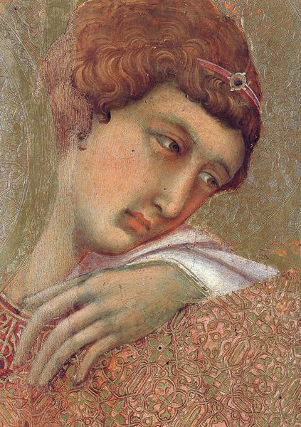 This is a fragment of "Madonna and Child on a Throne" by Duccio, created around the early 14th century. Notice the angel’s introspective gaze and melancholic expression, achieved through subtle gradations of light and shadow. The gentle curve of the head, resting on its hand, introduces a human element into the divine. Duccio employs gold leaf, not just for the halo but also as a background, emphasizing the spiritual realm, a common stylistic feature during this period. The intricate patterns on the angel’s sleeve offer a striking contrast to the smooth texture of the skin. Compositionally, the fragment draws us into the angel’s internal world, inviting reflection. Duccio’s skill lies in how these formal elements—color, line, and texture—converge to create an atmosphere of contemplative beauty. The artwork underscores the medieval understanding of religious iconography, where beauty and form work in tandem to inspire reverence and introspection.