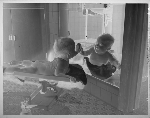 Editor: This intriguing photograph, titled "Untitled (bird flying away from woman in a hairnet)" by Jack Gould, really captures a sense of surrealism. I'm curious about how the composition directs our attention. What strikes you most about its formal qualities? Curator: The inverted tonality immediately grabs attention, doesn't it? The strong contrast between the dark and light areas flattens the space, emphasizing the linear quality of the blinds and the dynamic diagonal of the bird in flight. Notice how the artist contrasts the woman’s static posture with the bird’s active movement. Editor: That’s a great point about the contrast between stillness and motion. So, the tension arises from the juxtaposition of these formal elements? Curator: Precisely. The photograph's power lies in this interplay. It invites us to contemplate the implied narrative through visual form rather than explicit symbolism. Editor: I see it now, examining the structure leads to a new perspective of the image. Curator: Indeed, considering the form is key.
