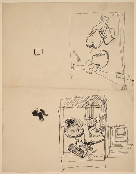 Curator: Here we have a sheet of figure sketches attributed to Mark Rothko, rendered in pen and ink. Editor: My immediate reaction is, these feel like thoughts caught in a net—almost accidentally human, swirling on the page. There's a frantic energy in these sketches. Curator: That "frantic energy," as you call it, perhaps speaks to the rapid-fire thought process Rothko was engaging in. Rothko, even as an abstract expressionist later in his career, was very committed to figuration. These sketches serve as vital reminders of the historical and philosophical underpinnings that influenced his entire oeuvre, reminding us to reevaluate the relationship between the figurative and the abstract. Editor: True, they don’t feel fully formed, yet possess such potent vulnerability. Look at the woman reaching toward the man. Is it a gesture of support, desperation, love, or even resentment? I see a tangle of human emotions there—in just a few lines! Curator: This ambiguity is so critical, don't you think? Because in considering Rothko’s relationship to politics, and specifically radical Jewish politics in the early 20th century, it's so critical to understand his engagement with the human condition through an empathetic, albeit often fraught, lens. Editor: The marks feel deeply private, even secretive, but at the same time, somehow, they echo feelings we’ve all had. Do you think he ever intended to show these? Curator: Whether or not he intended to exhibit these is beside the point. The sketches function as windows into Rothko's method and thinking. The unfinished nature doesn't diminish their potency, rather it makes them compelling objects of study and discussion. Editor: You’ve definitely given me some things to think about. I now view it as both deeply personal but also universally relatable. Curator: Yes, exactly! Thinking about this from the perspective of someone examining the social role of art is critical, and it gives us something tangible to hold onto in Rothko's evolution as an artist.