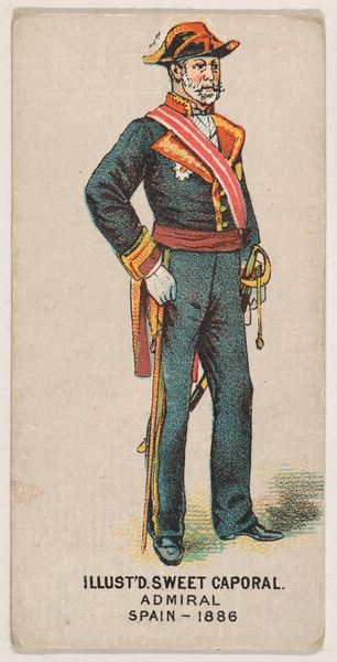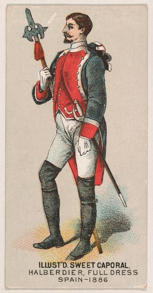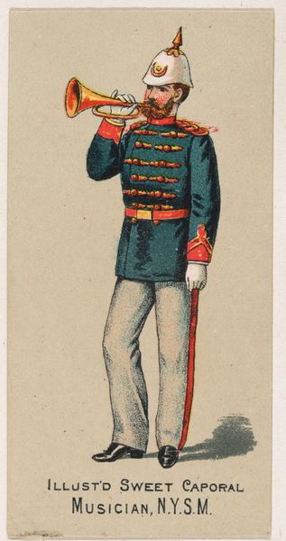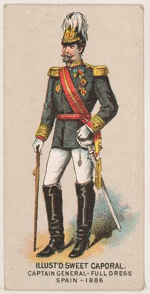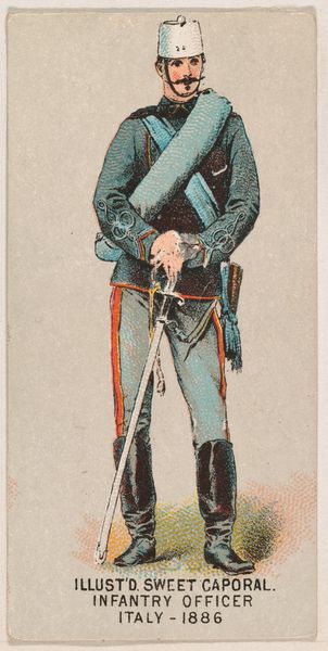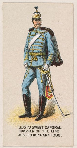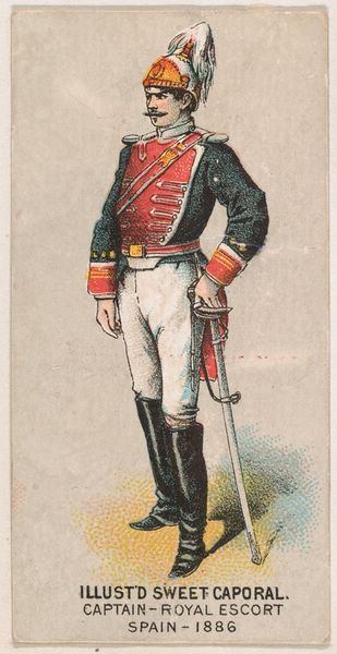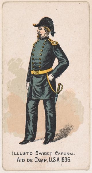 Curator: Here we have “Infantry, Prussia, 1840” from the Military Series, an 1888 chromolithograph by Kinney Tobacco Company, originally inserted in packs of Sweet Caporal Cigarettes. Editor: My first impression is one of a rigid elegance, the stark contrast between the dark uniform and pale breeches lending a stylized air. Curator: Precisely. Kinney Brothers employed color and detailed line work to offer consumers attractive premiums that highlighted military figures of the time. These cigarette cards became quite a fad! Editor: The sword he carries almost appears as more decoration than a weapon, it adds a rather gallant aura overall. Can we really say, this dapper image is one we associate with soldiers these days? Curator: That's the clever thing about this sort of ephemera, isn’t it? It offers insight into how institutions like the military projected power and prestige at a given historical moment, which seems so very different from today. Editor: The tall, feathered hat also seems an obvious display of power—perhaps not meant to intimidate on the battlefield but more in service of pomp and display for patriotic spectacle. Curator: A spectacle directly connected with trade! Consider how this illustration collapses high-end portraiture and nationalistic fervor with everyday consumption of mass-produced products like cigarettes. The role of art is certainly always changing. Editor: Absolutely, seeing how symbols of power change function in relation to consumerism gives me a perspective of where visual culture may evolve towards in the future. Thank you! Curator: My pleasure, let's see how else our visual language might guide or mislead us.