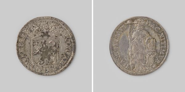 This coin, designed by Theodorus Victor van Berckel, is made of silver and has a diameter of 3 centimeters. Think about how this coin would have been made. The silver, extracted through mining and refinement processes, would have been melted down. The design was carefully engraved into dies, which were then used to stamp the image onto the metal. On one side is a lion, symbol of the region, and on the other two hands clasped under radiating light. These images and Latin motto served a propaganda function for the newly declared republic. Coins such as this one blur the lines between art, craft, and industry. While each coin is identical to the next, they are the product of artisanal skill, as the dies must have been produced by a highly skilled hand. It prompts us to consider how the mass production of such an object is tied to wider social issues of labor, politics, and consumption. By understanding its materials, making, and context, we can see how it challenges traditional distinctions between fine art and craft.