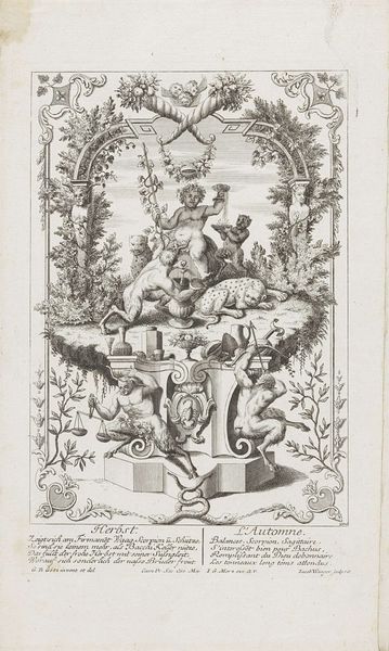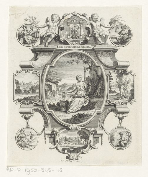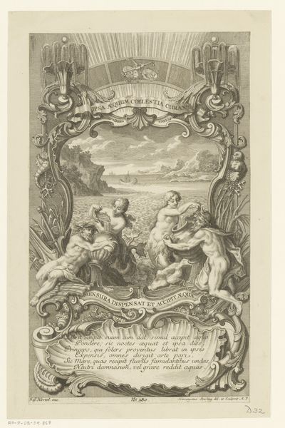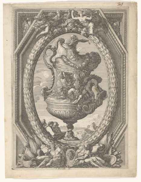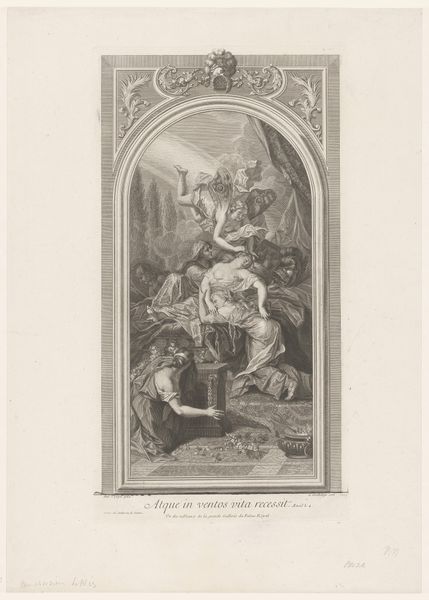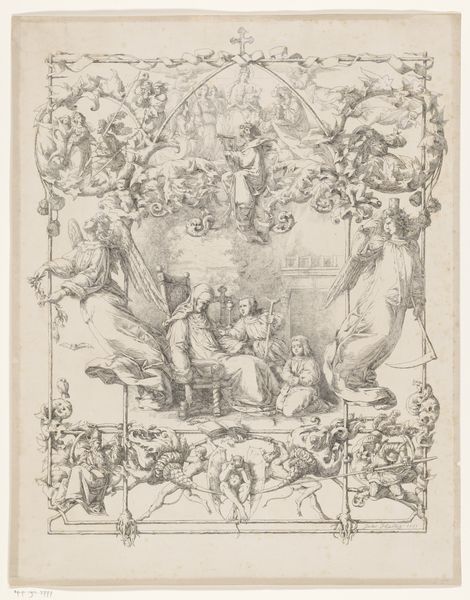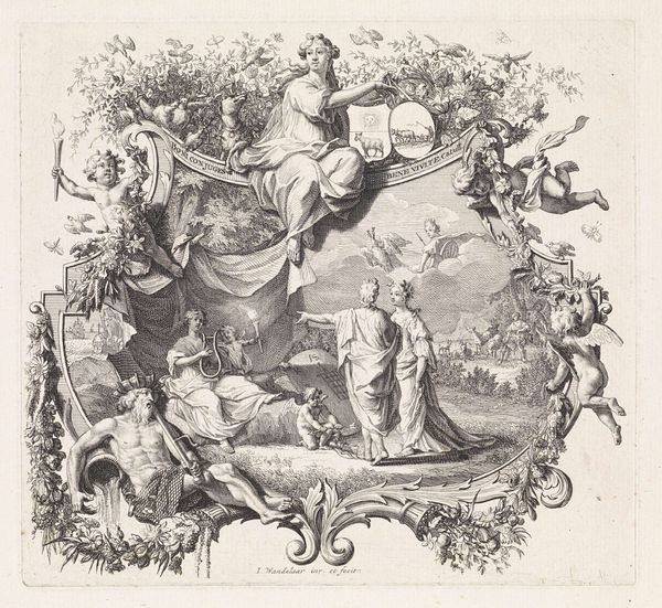 François Antoine Aveline created this undated print depicting an Allegory of Medicine. Its monochrome lines form a complex image, framed with ornate flourishes, presenting a scene both earthly and celestial. The lower half shows medical professionals attending to a patient, while above, divine figures float on clouds. This division suggests a hierarchy, with the earthly realm dependent on the celestial for knowledge and healing. The symmetry in the composition — cherubs mirroring each other on either side of the frame, books balancing wings below — lends a sense of order. But this order is disrupted by the dynamic flow of lines, pulling our eyes across the image. Aveline employs a semiotic system where clouds symbolize the heavens, and medical instruments represent earthly practice. The interplay between these elements challenges fixed meanings, suggesting that true understanding comes from integrating both divine wisdom and practical experience. This piece invites us to see knowledge not as static, but as an evolving dialogue.